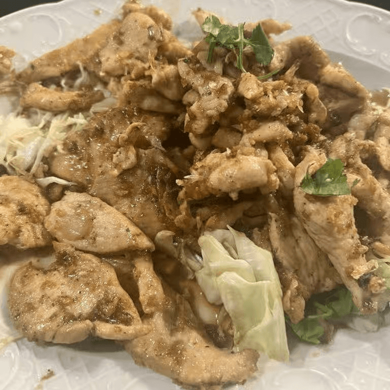 Crispy, savory fried beef strips marinated in garlic and coriander.