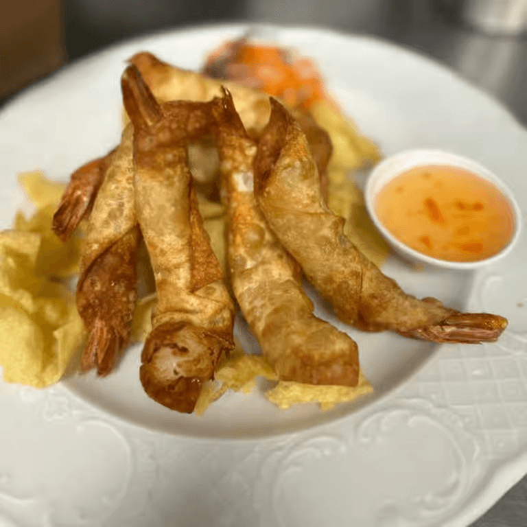 Whole shrimp wrapped in spring roll skins and fried until crispy. served with a sweet and sour dipping sauce.