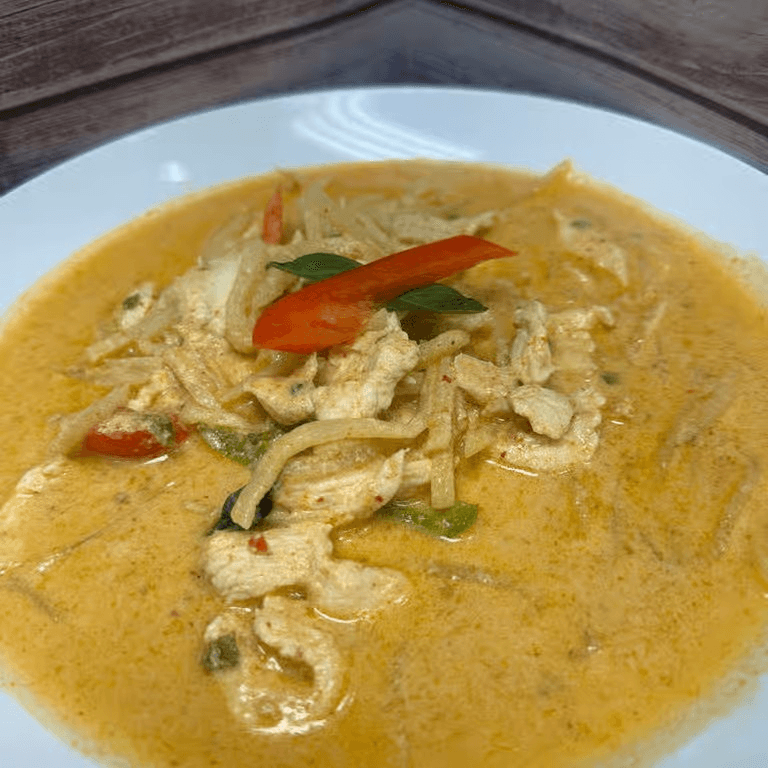 Aromatic red curry simmered with bamboo shoots, bell peppers, and fresh thai herbs in creamy coconut milk.