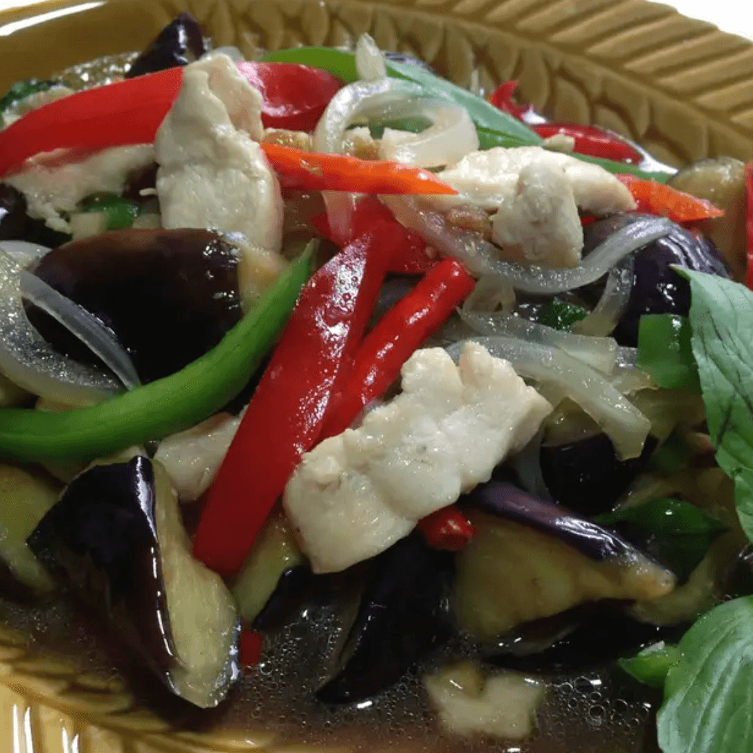 A classic thai stir-fry with eggplant, chili, garlic, basil, and soy-based sauce.
