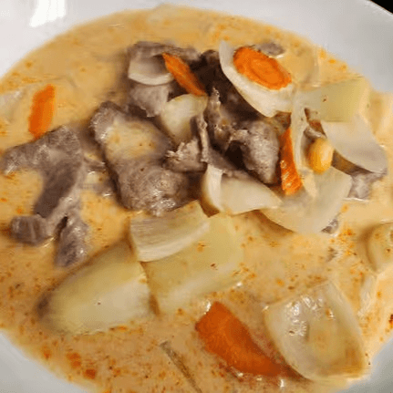 Rich and mildly spiced massaman curry simmered with potatoes, onions, and roasted peanuts.