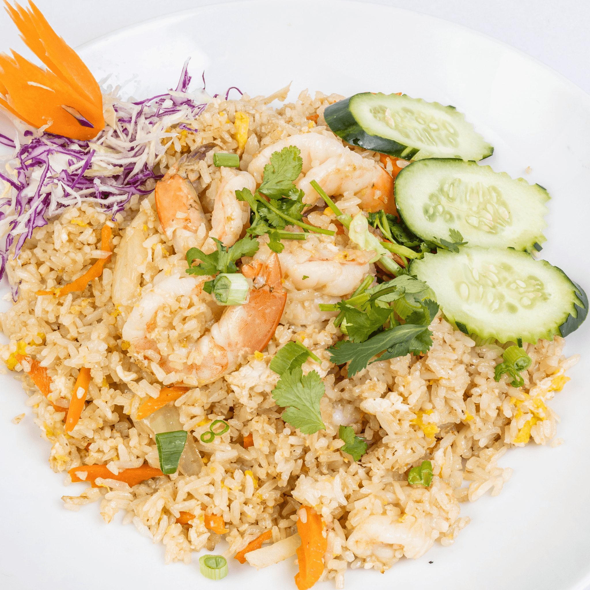 Wok-seared jasmine rice loaded with chicken, BBQ pork, and shrimp, blended with egg.