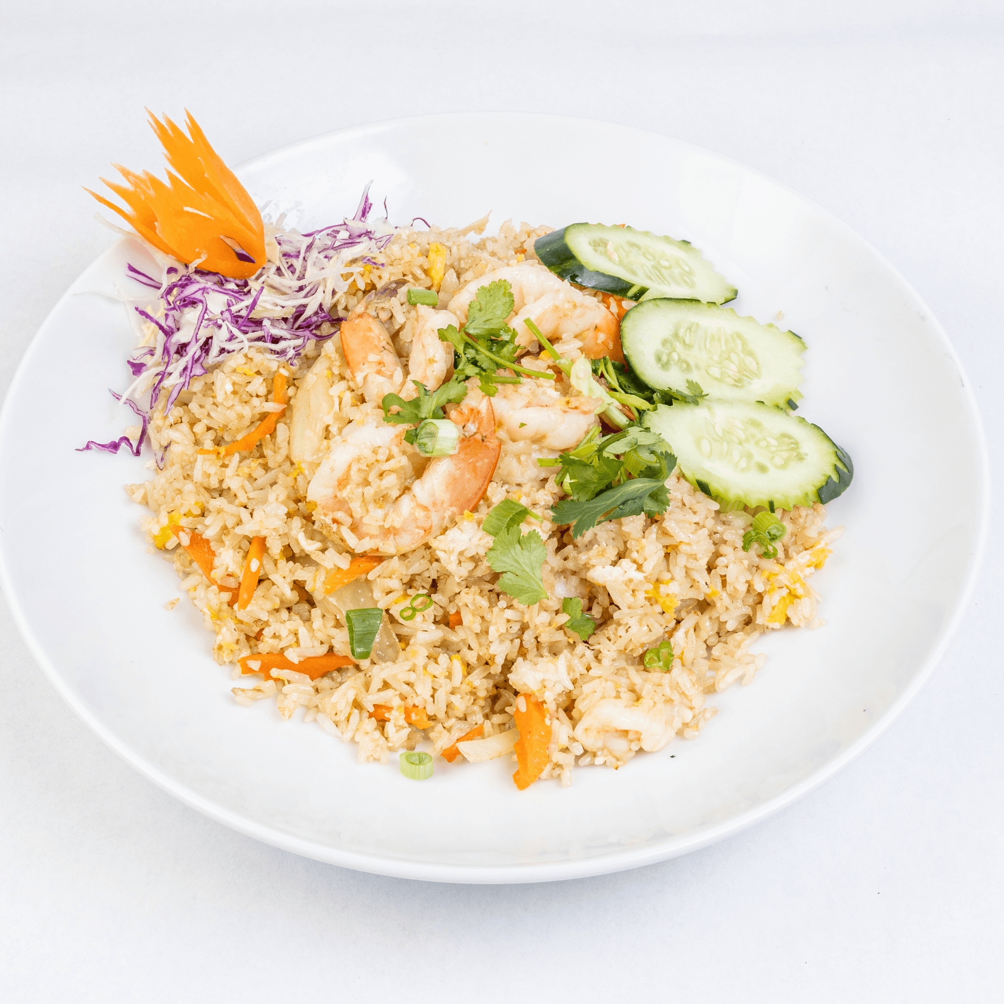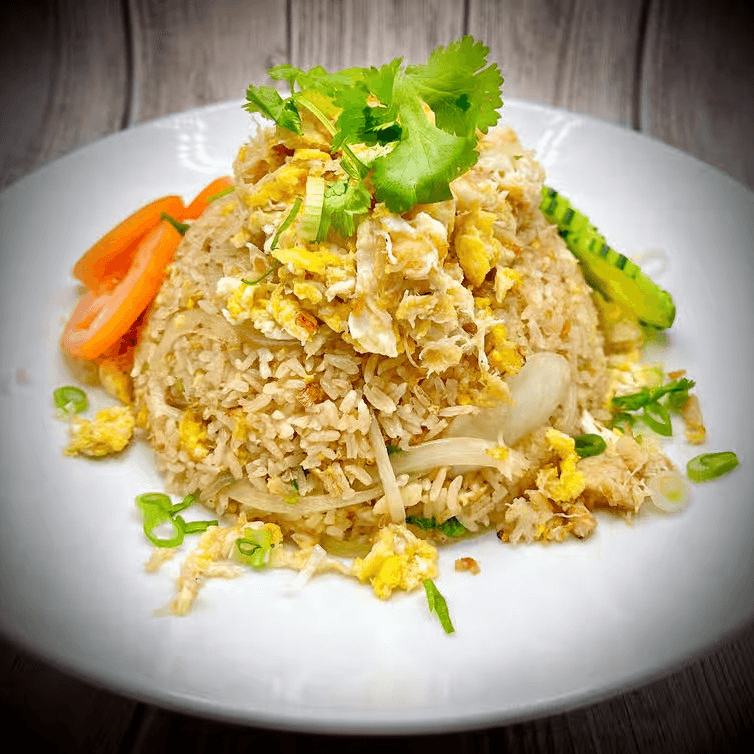 Jasmine rice stir-fried with egg, onions, and green onions, tossed with tender crab meat in a light, savory sauce.