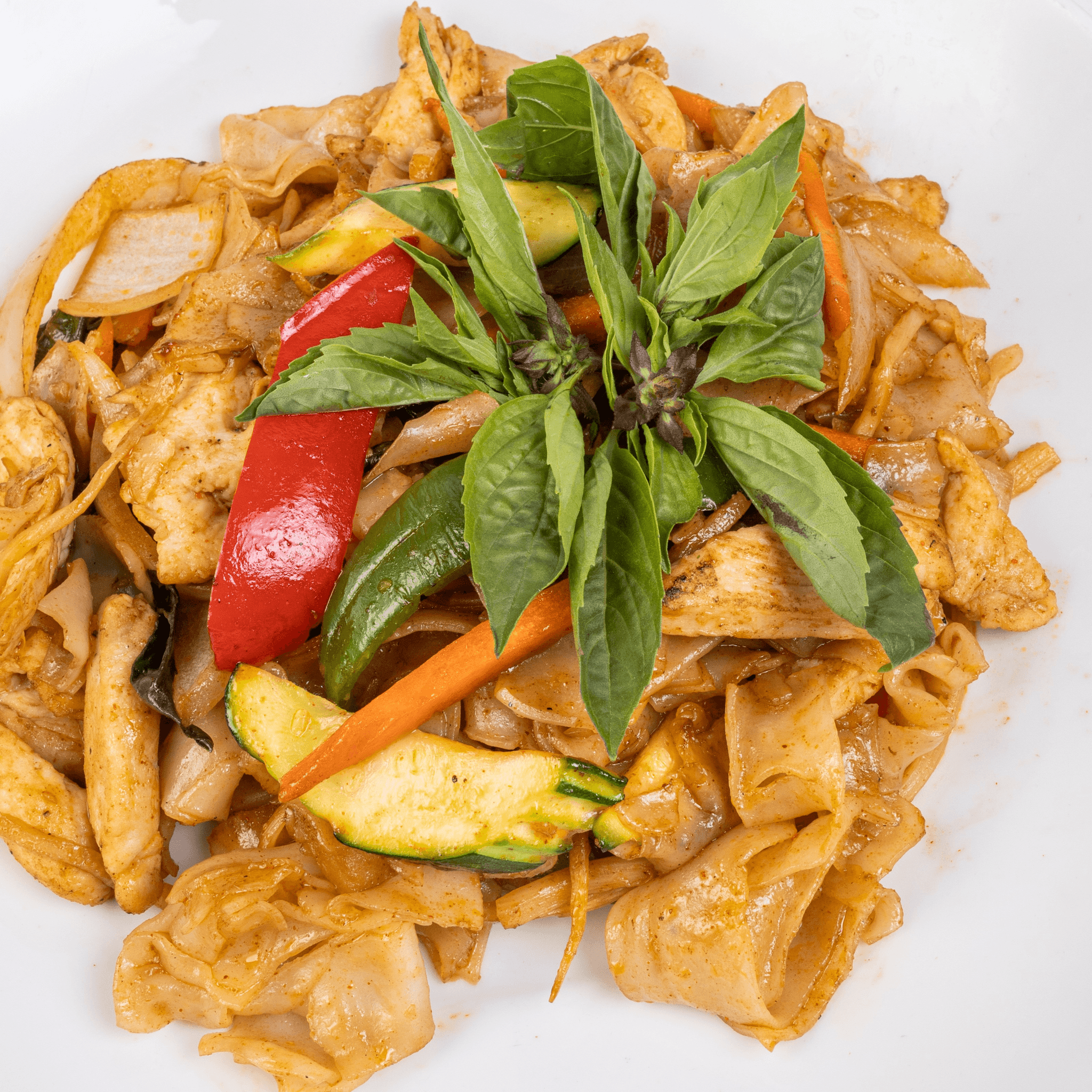 Wide rice noodles stir-fried with fresh chili, garlic, bell peppers, onions, and thai basil.