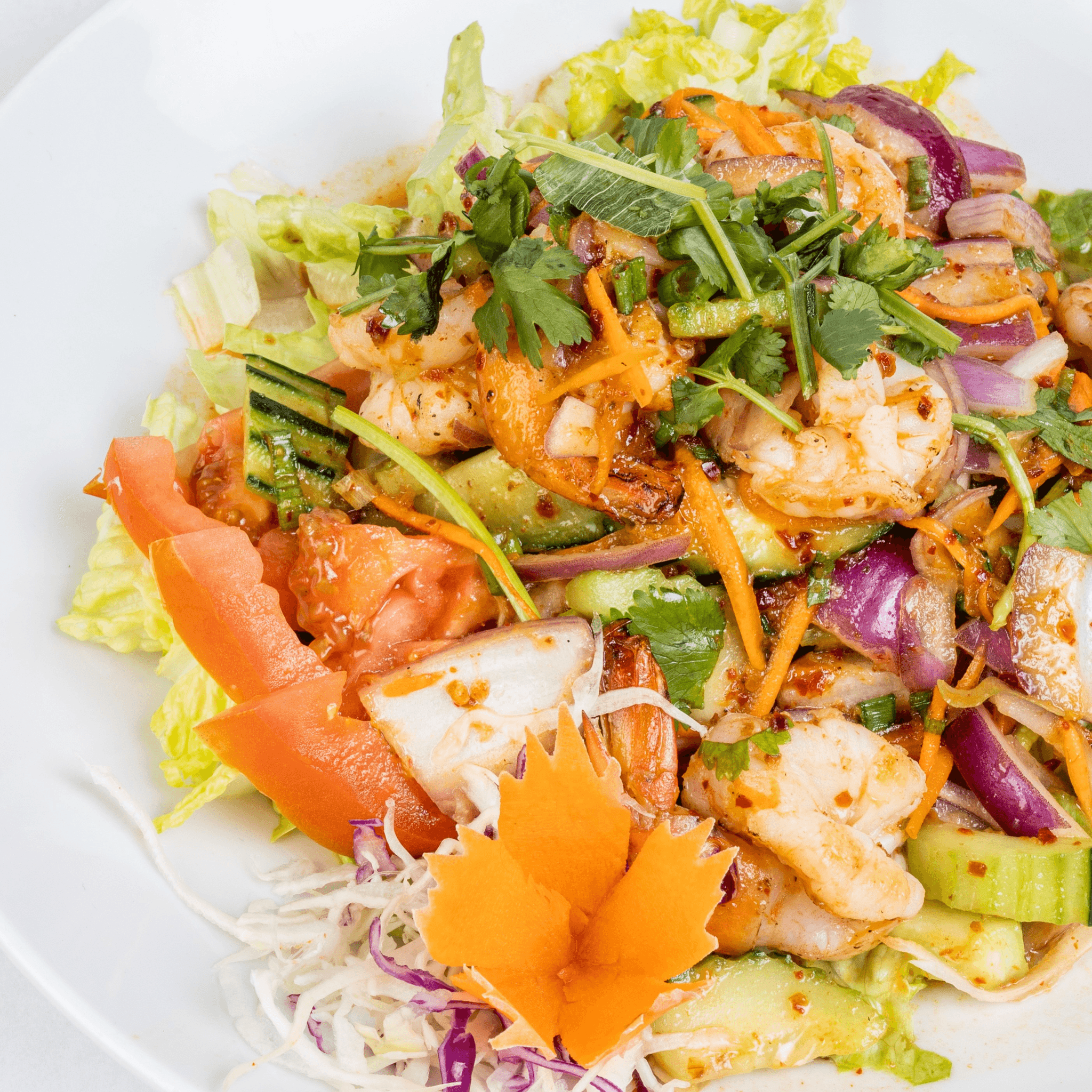 Tender shrimp tossed with fresh lime juice, chili, lemongrass, red onion, mint, and cilantro.