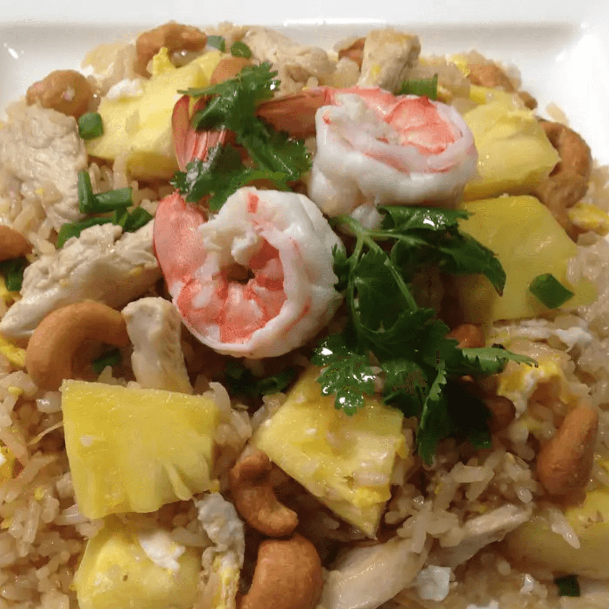Traditional thai fried rice with fresh pineapple, egg, and roasted cashews, seasoned with a light savory sauce.