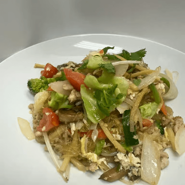 Silky glass noodles sautéed with fresh vegetables and egg in our house's savory sauce.