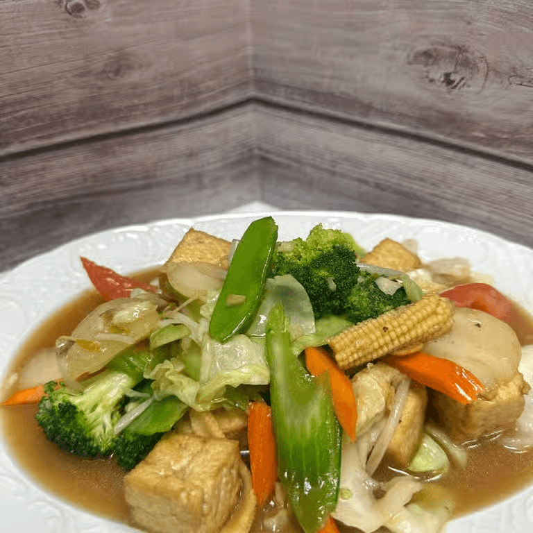 A colorful medley of fresh seasonal vegetables stir-fried with garlic and a light, savory sauce
