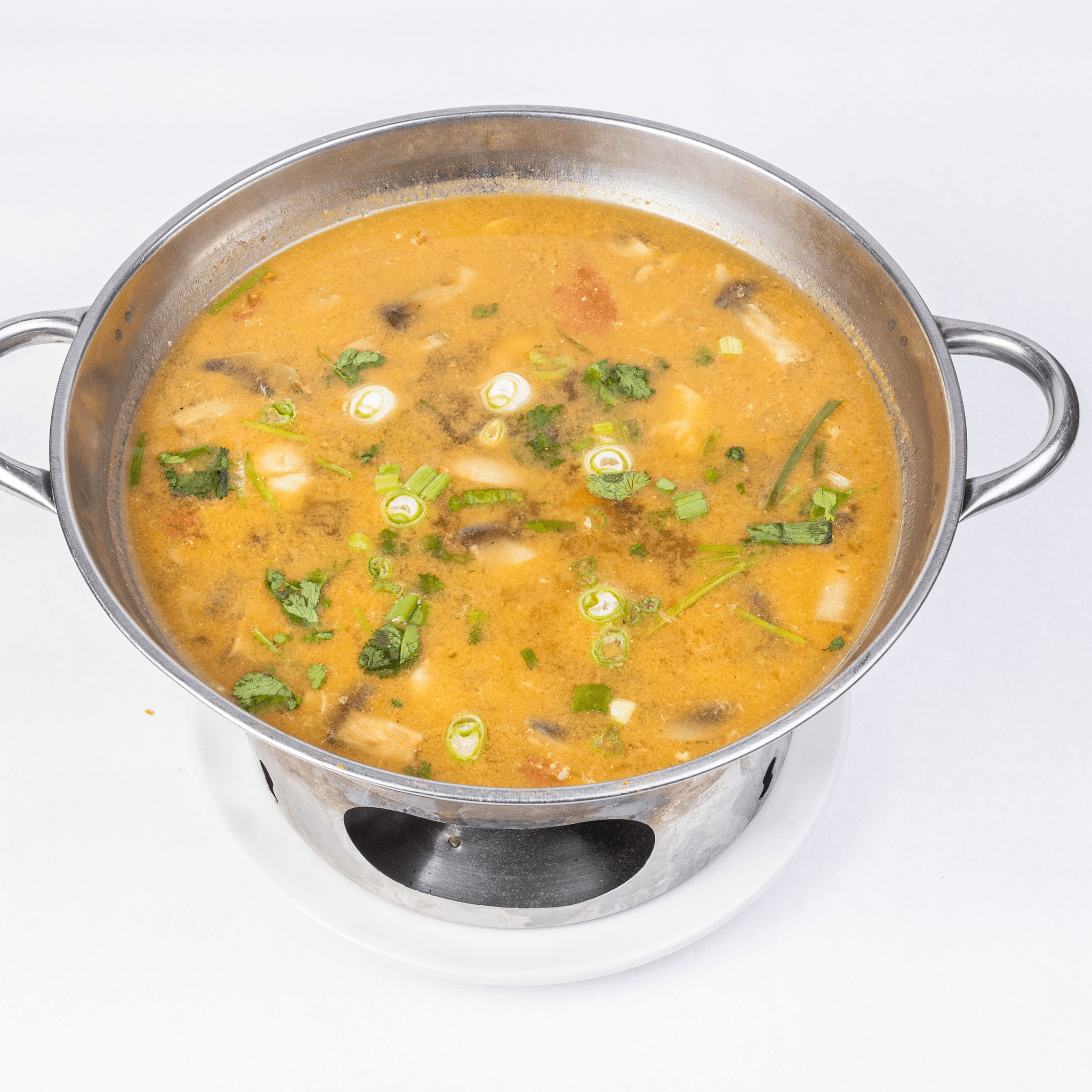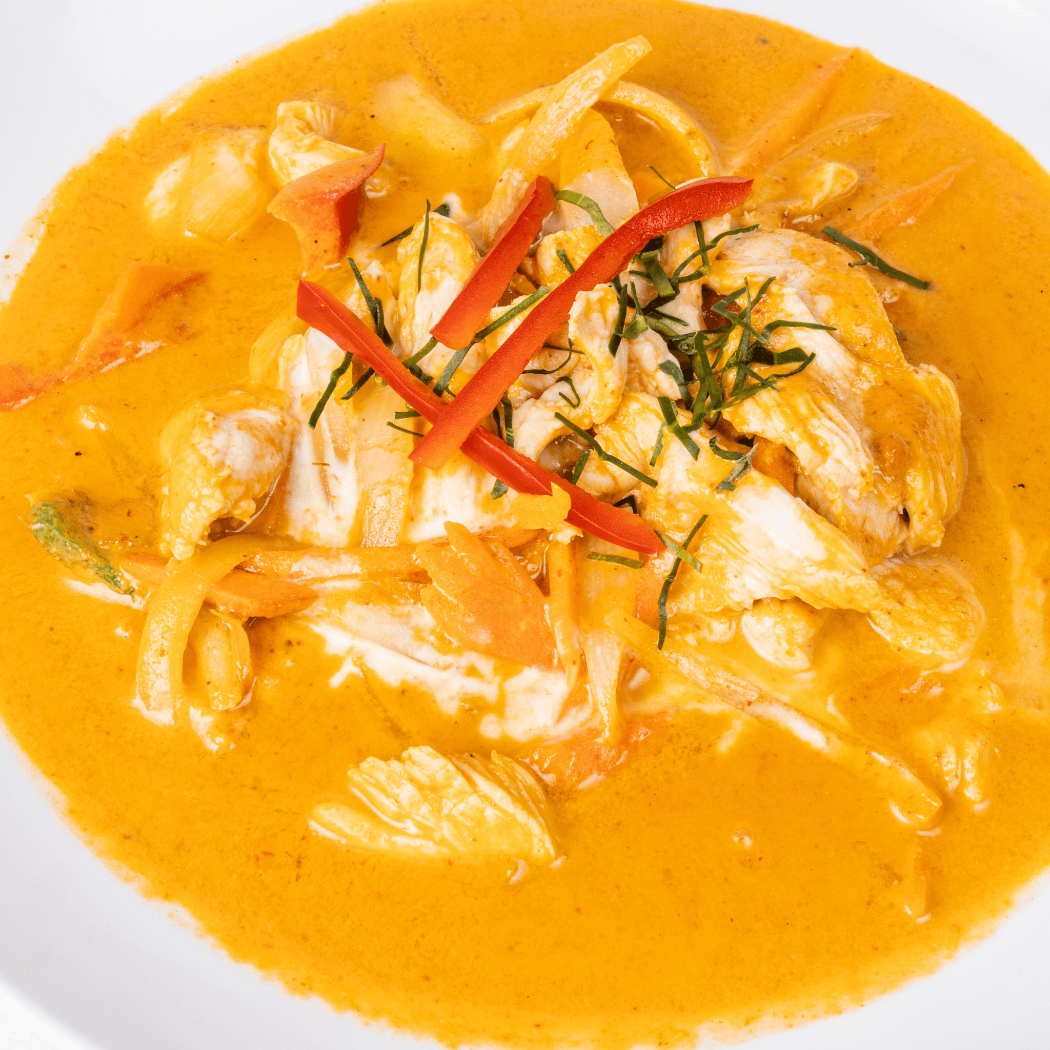 Creamy coconut curry gently simmered with vegetables and fragrant kaffir lime leaves.