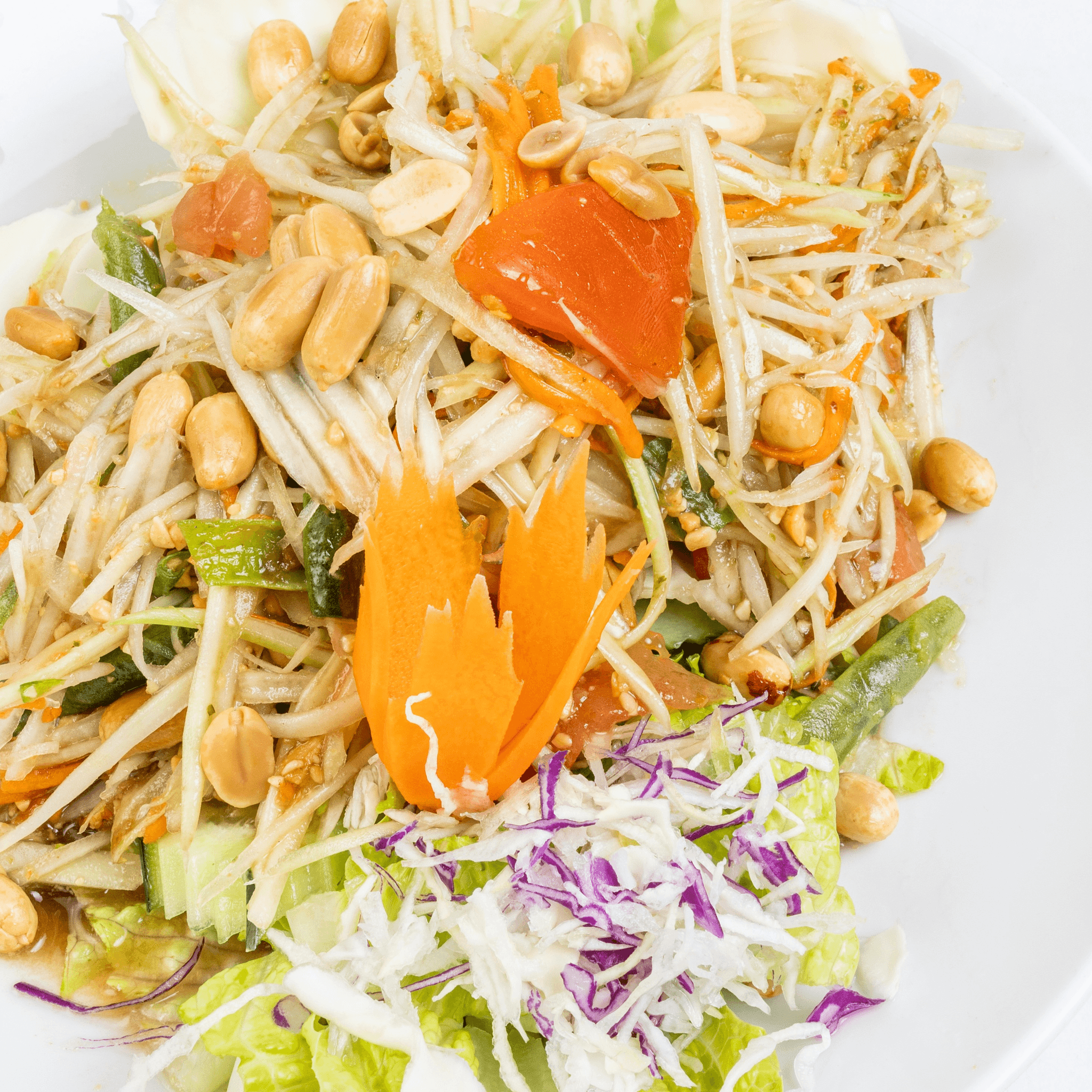 Shredded green papaya tossed with lime juice, fish sauce, palm sugar, chili, tomatoes, and green beans.
