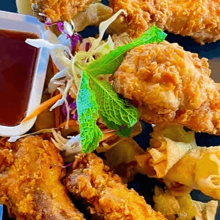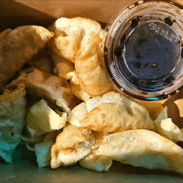 Golden-fried dumplings stuffed with savory minced chicken. served with a side of dipping sauce.