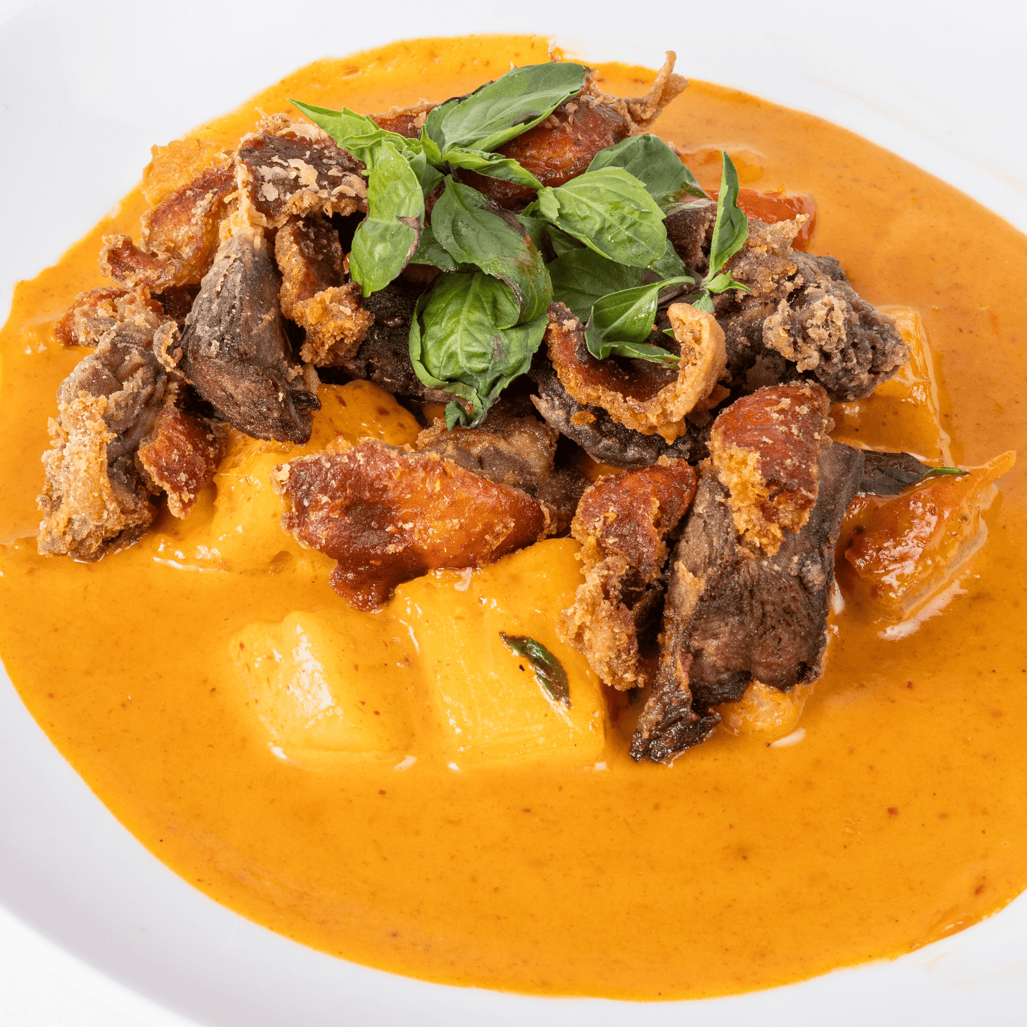 Golden crispy duck simmered in rich red curry with pineapple, tomatoes, and fresh thai basil.