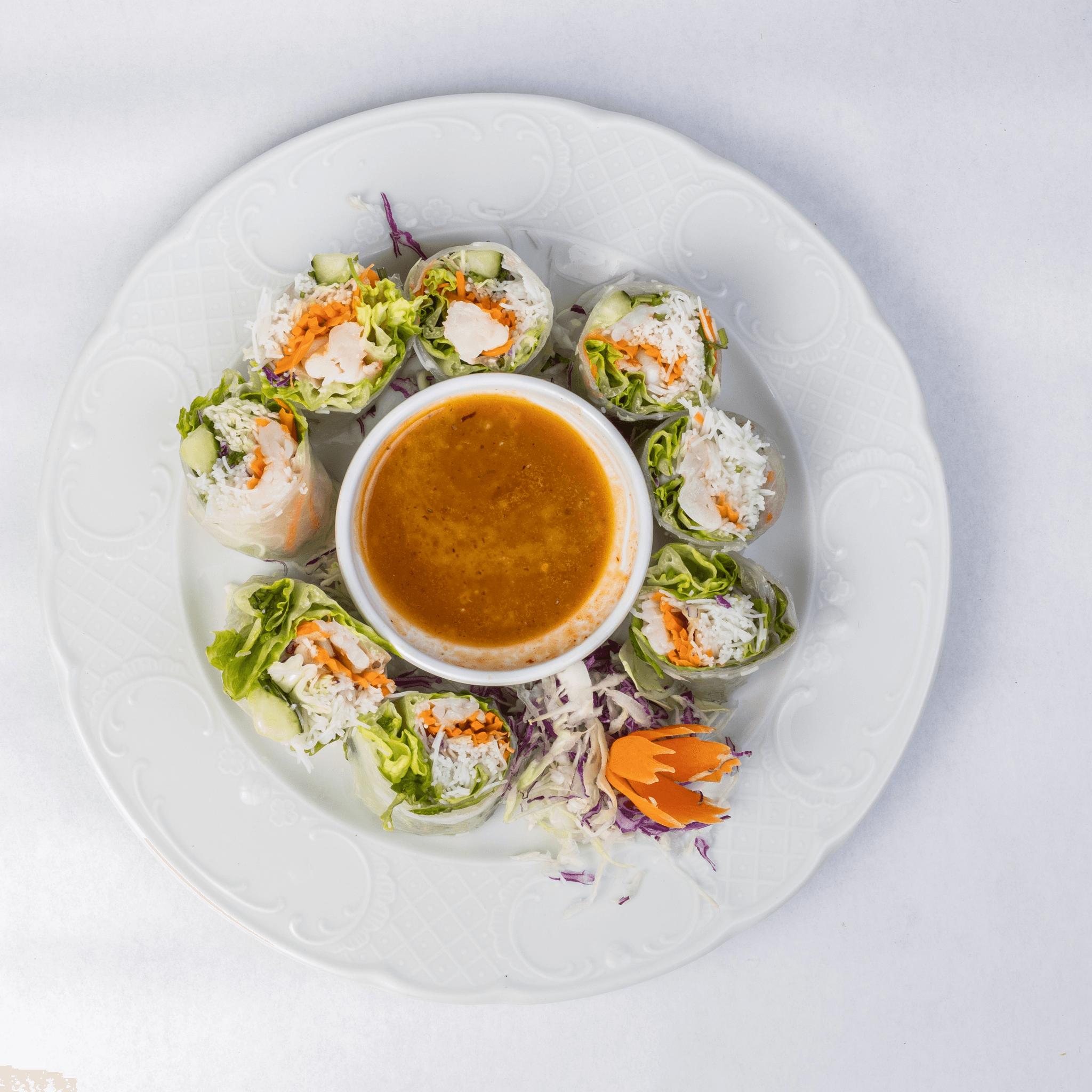 Rice paper wrapped with crisp vegetables, herbs, and your choice of shrimp or tofu. served with peanut sauce.