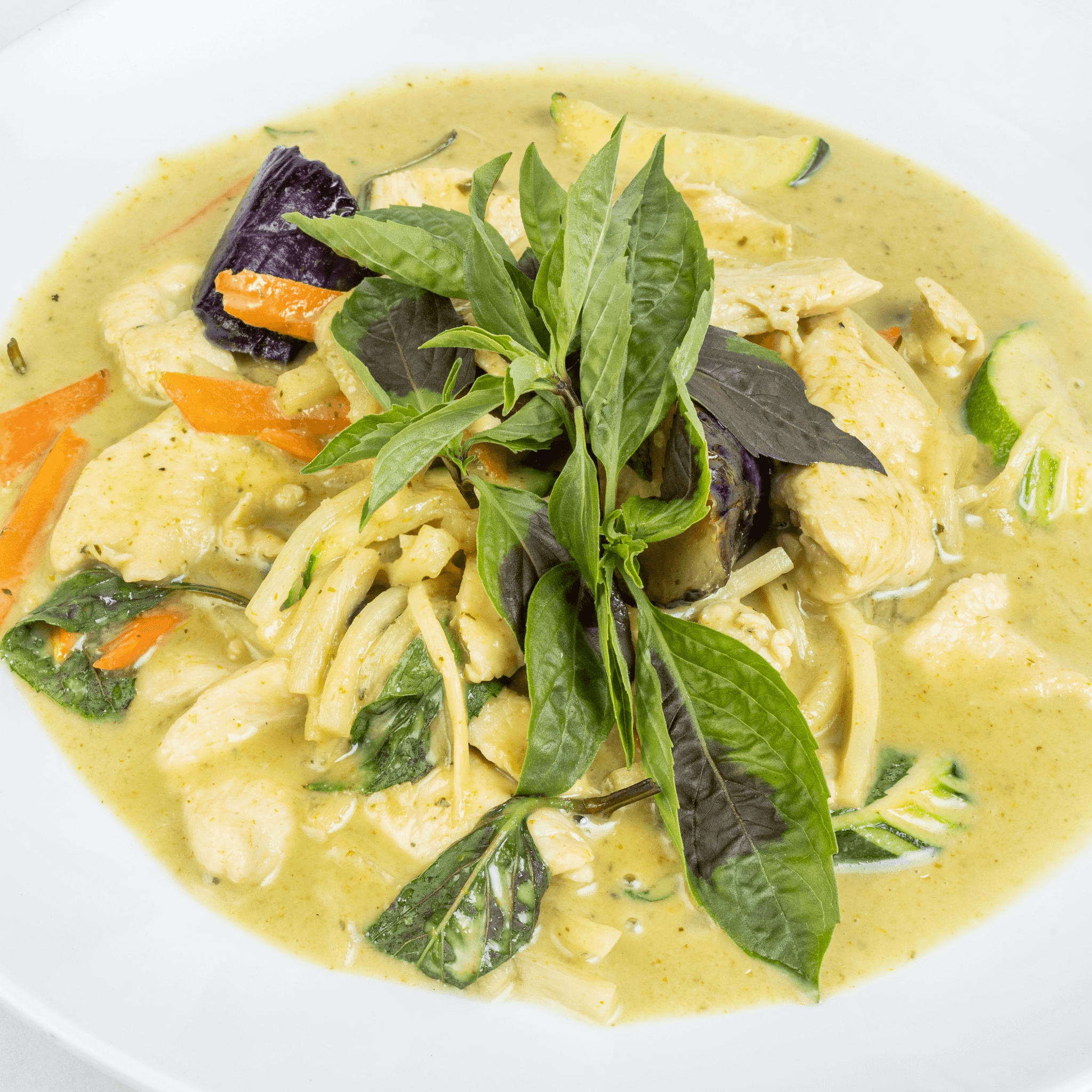 Fragrant green curry simmered with eggplant, bell peppers, bamboo shoots, and fresh thai basil in creamy coconut milk.