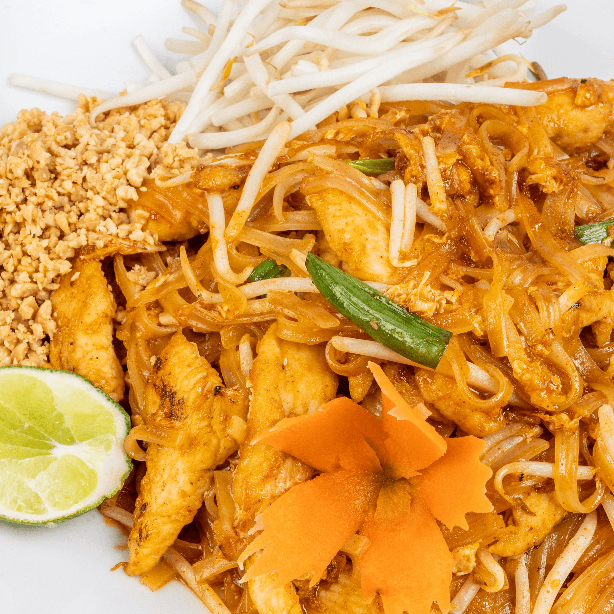 Wide rice noodles stir-fried with tender chicken, egg, bean sprouts, and green onions in a savory soy sauce.