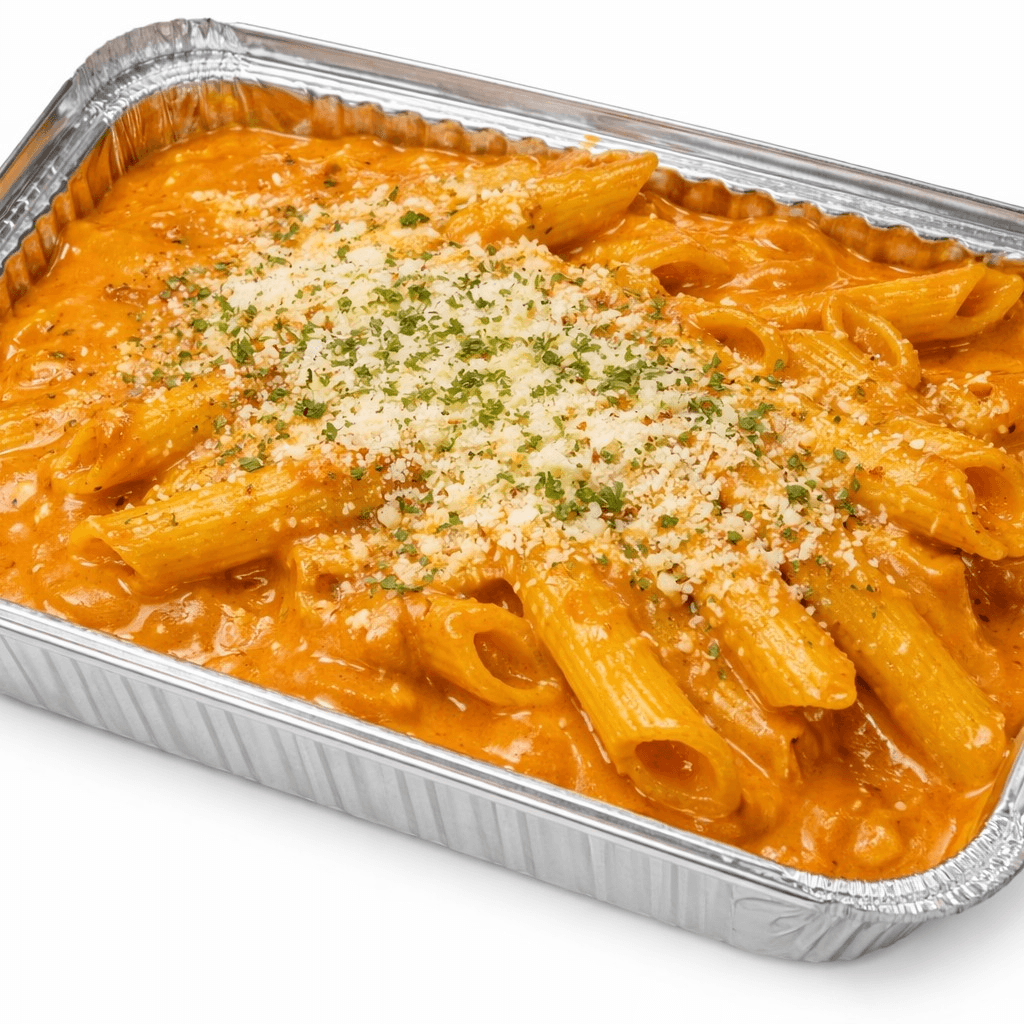 Tender penne pasta tossed in a silky tomato cream sauce infused with a touch of vodka, garlic, and subtle herbs, then topped with delicate slices of prosciutto. Smooth, rich, and beautifully balanced, this classic favorite delivers a luxurious creaminess with a savory, slightly salty finish.