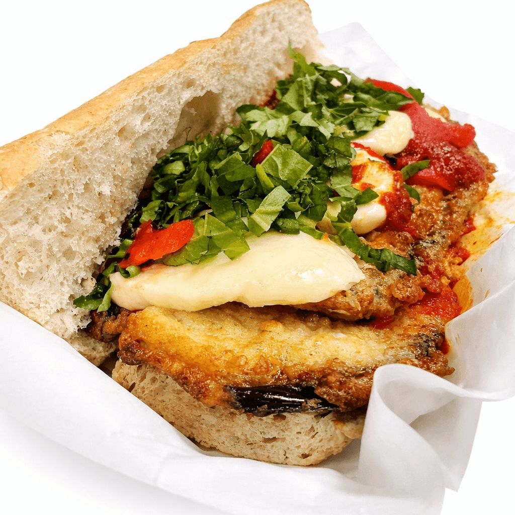8" Crispy breaded eggplant topped with rich marinara sauce and melted mozzarella, served on a fresh, homemade baguette. Warm, saucy, and perfectly satisfying, this classic favorite delivers bold Italian comfort in every bite.