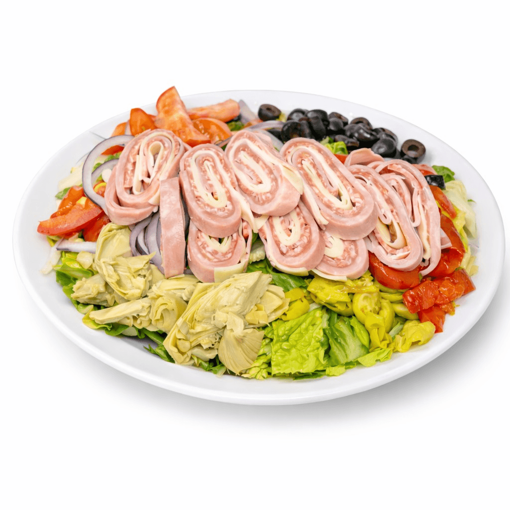 Lettuce, tomatoes, olives, red onions, ham, salami, provolone cheese, prosciutto, roasted peppers, artichoke, spicy pepperoncini, oil & vinegar dressing.