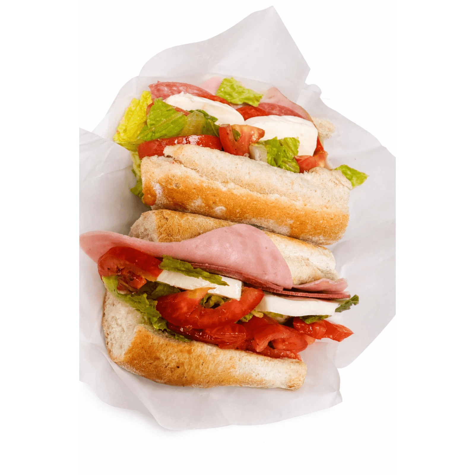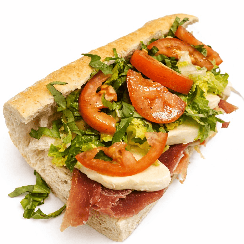 8". Ham, salami, pepperoni, fresh mozzarella, lettuce, tomatoes, oil & vinegar
