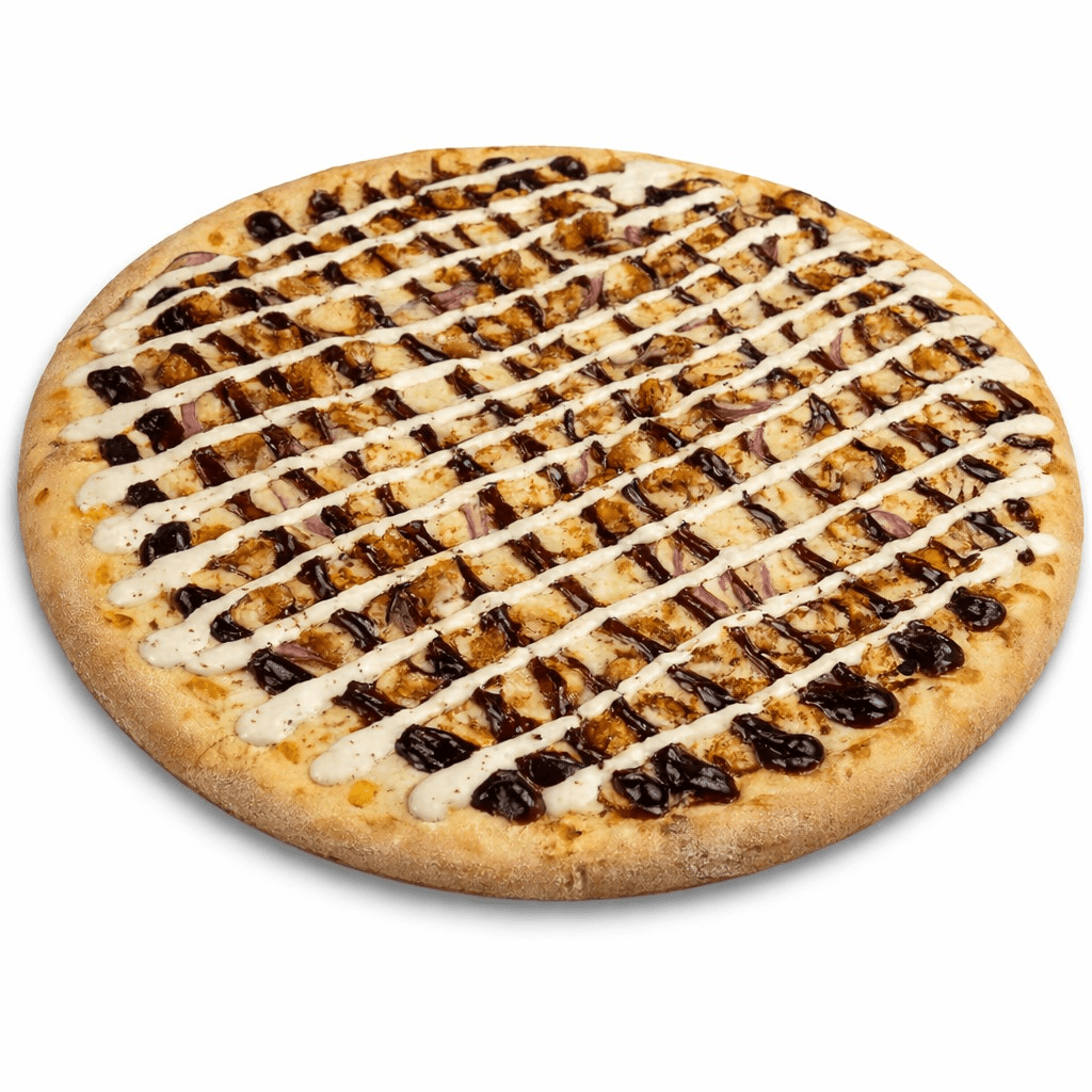 A crowd-pleasing favorite topped with juicy BBQ chicken, melted mozzarella, and crispy red onions, all baked on our signature New York–style crust. Finished with a bold drizzle of tangy BBQ sauce and creamy ranch, this pizza delivers the perfect mix of smoky, sweet, and savory in every bite.