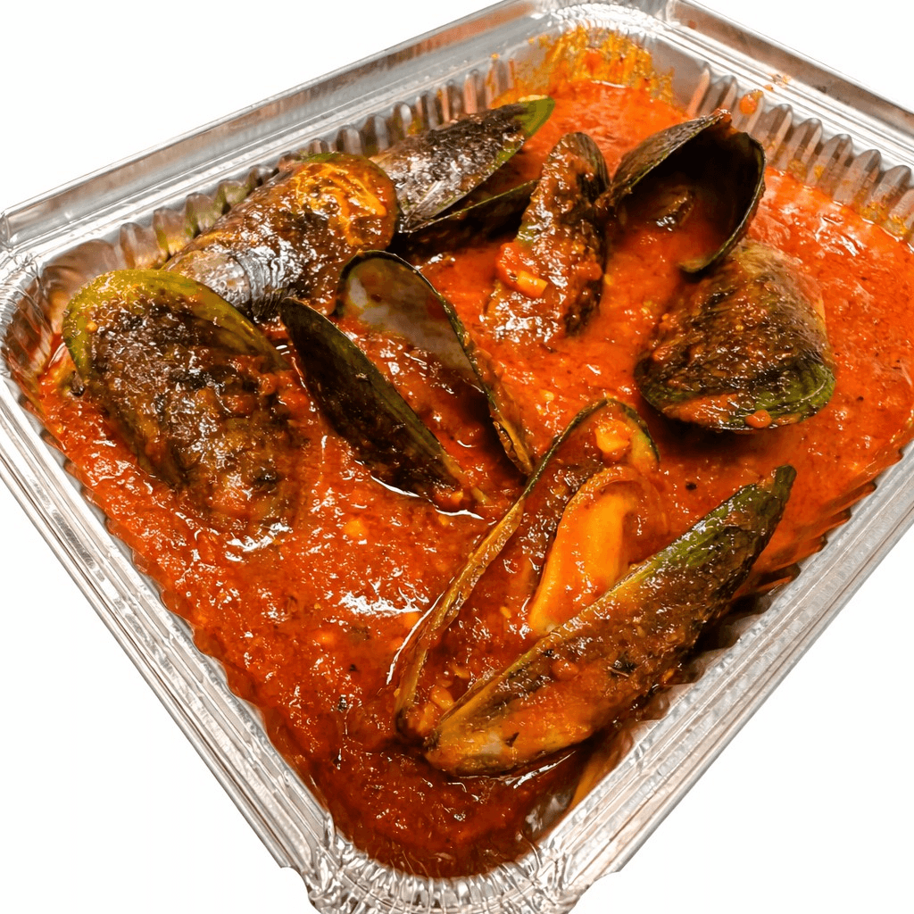Tender, flavorful mussels baked in our house marinara sauce. Choose your preferred heat level: hot for a spicy kick or sweet for a rich, smooth tomato finish. A comforting and savory seafood starter perfect for sharing.