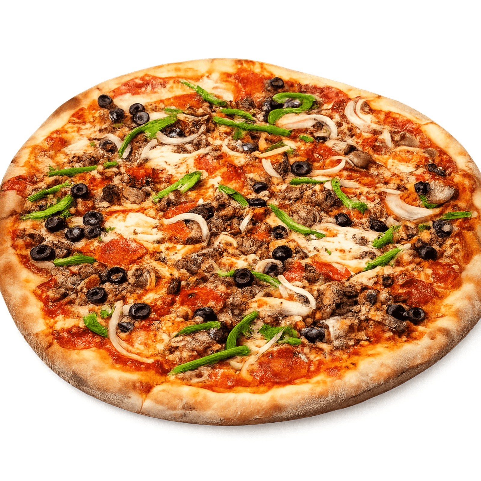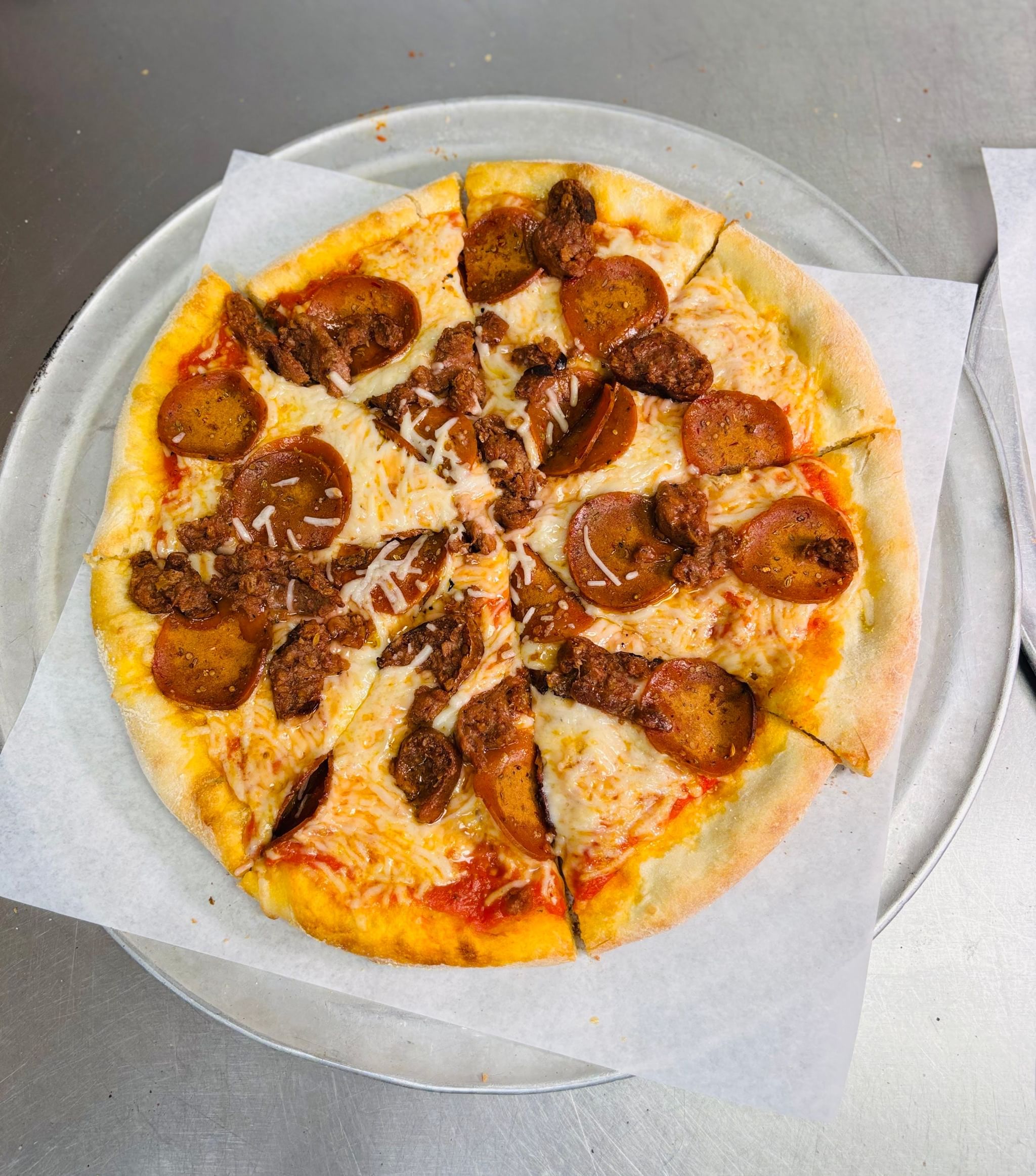Piled high with pepperoni and sausage Available daily. New York pizza is a large, thin‑crust classic—crispy on the outside, soft in the middle, with rich tomato sauce and melty mozzarella, perfect for folding and savoring