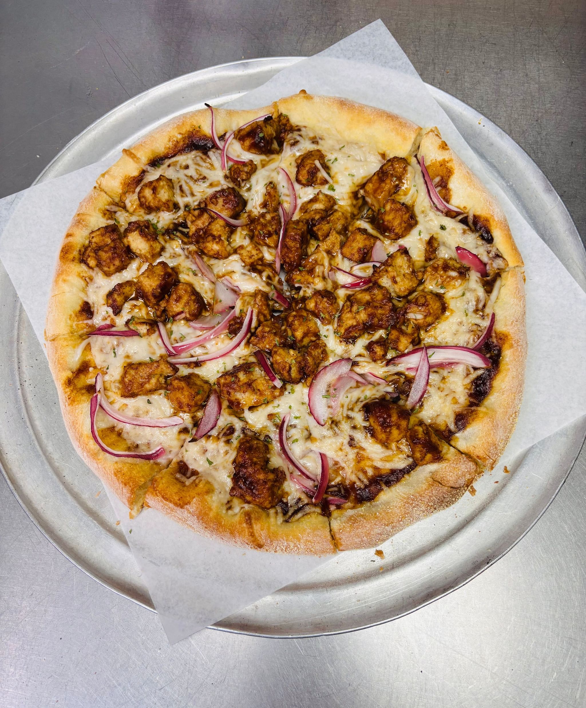 Our classic NY style crust, tangy BBQ sauce, dairy free mozzarella, vegan tender chicken strips, red onions and herbs