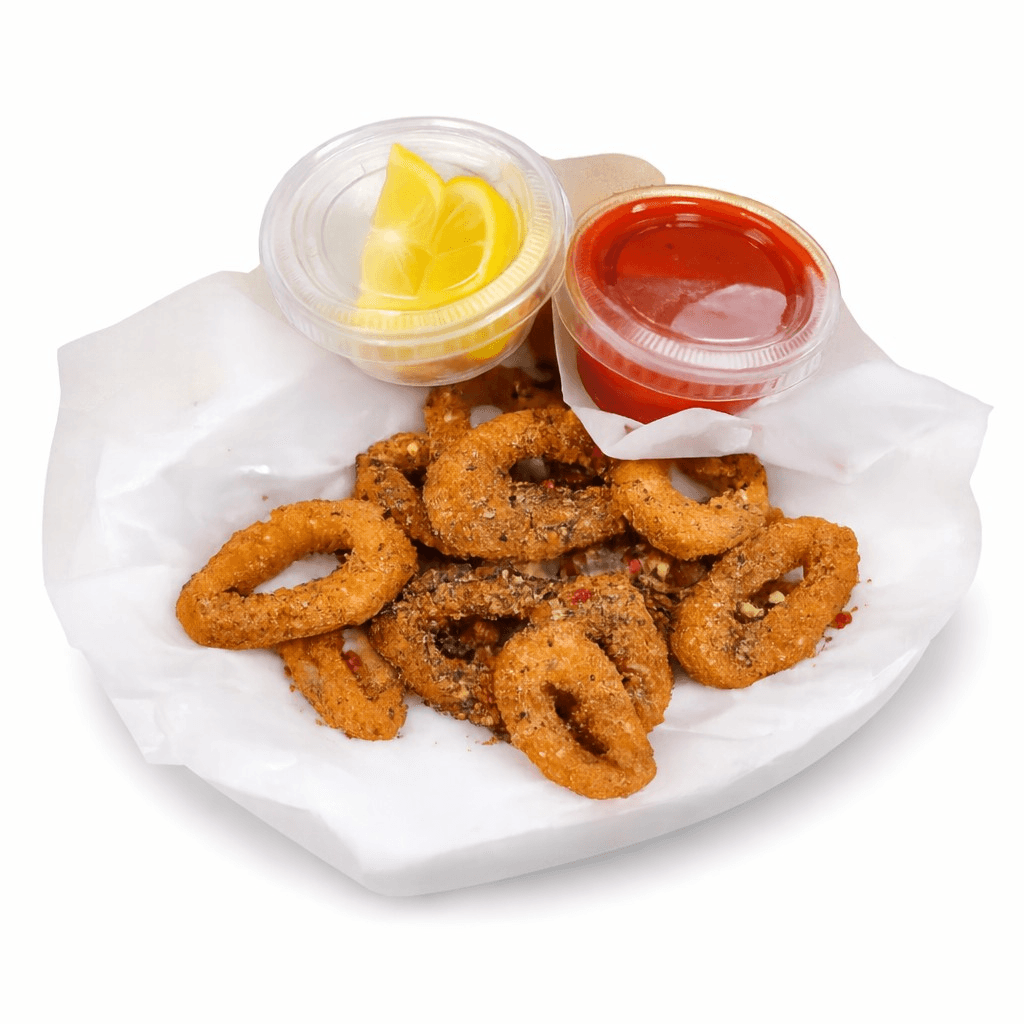 Delicious calamari, with a golden crust with marinara dipping sauce