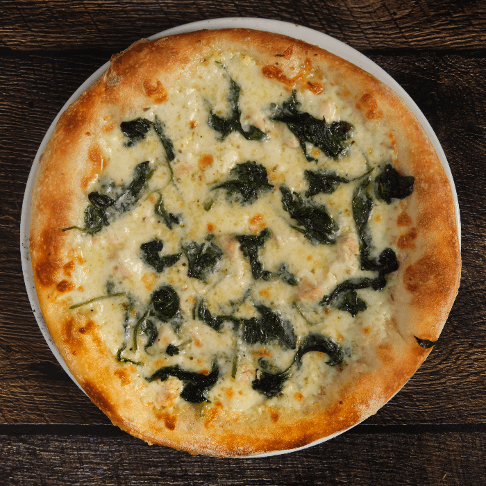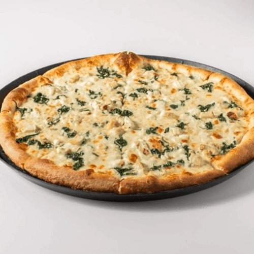 White pizza with our garlic cream sauce, Mozzarella, chicken, spinach and Feta cheese.