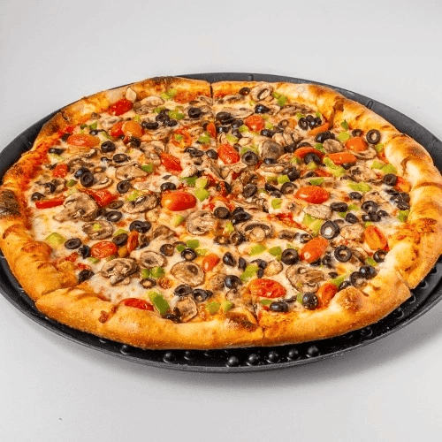 Green pepper, mushrooms, onions, cherry tomatoes and black olives.