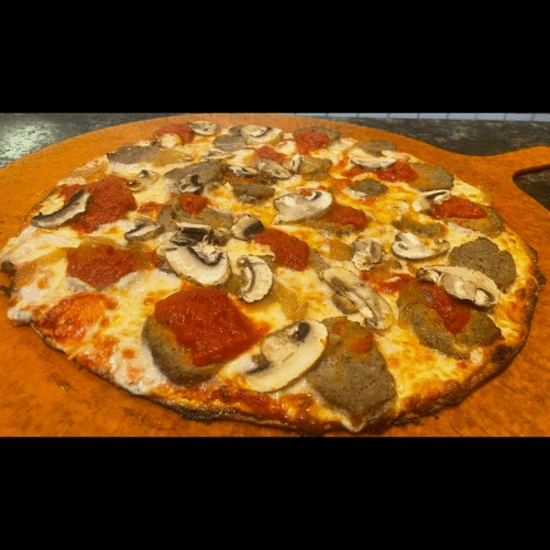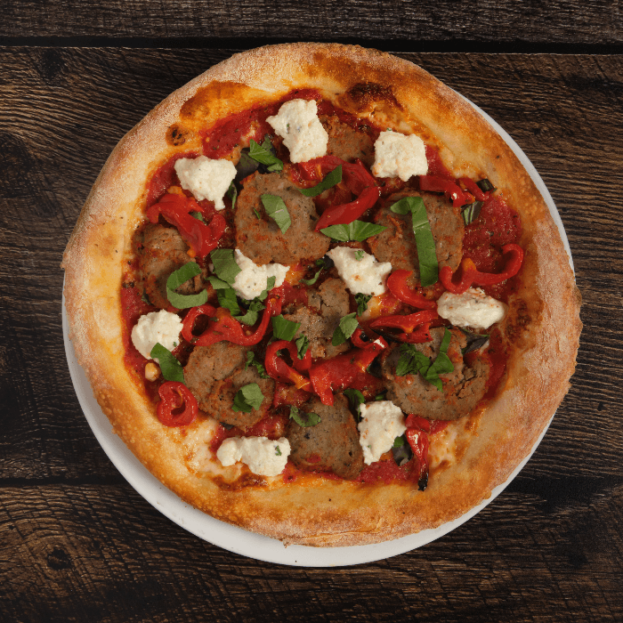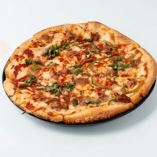 Sausage, peppers and onions. Made with thick slices of Mozzarella, rich tomato sauce, fresh basil and extra virgin olive oil.