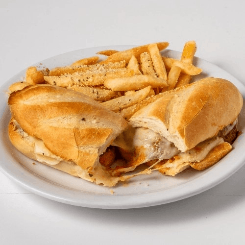 Our Meatball Sub served with Garlic Romano Fries