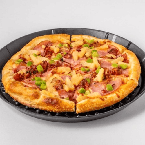 Our Hawaiian pizza made with ham, pineapple, onions, green peppers and bacon bits.
