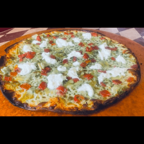 Pesto, artichokes, aged mozzarella, roasted red peppers, finished with creamy Stracciatella.