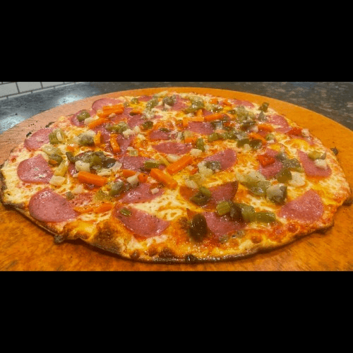 Genoa salami and creamy mozzarella, finished with spicy giardiniera.