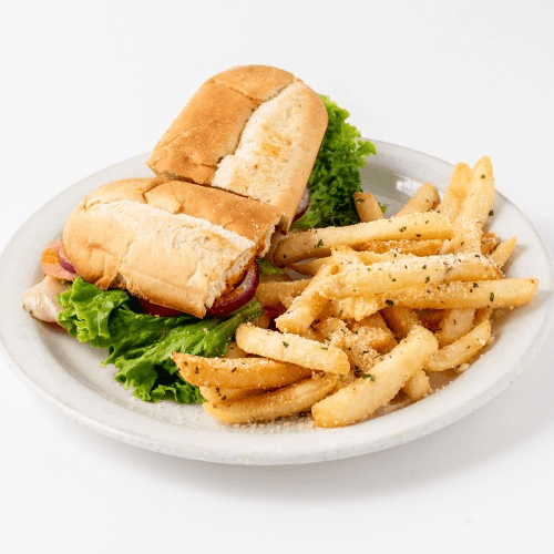 Ham, salami and Provolone with sweet red peppers, lettuce, tomatoes, onions and house dressing. Served with Garlic Romano Fries.