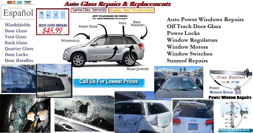 Auto Glass Repairs And Auto Glass Replacements , Same Day Service Mobile Auto Windows Replacements, Windshields, Door Glass,Vent Glass,Quarter Glass, Back Glass, Truck Glass, Rear Glass, Front Glass Power Window Repairs , Window Motors, Window Regulators, Window Switches, Off Track Door Glass, Electric Window Repairs, Sunroofs, Convertible Tops.
