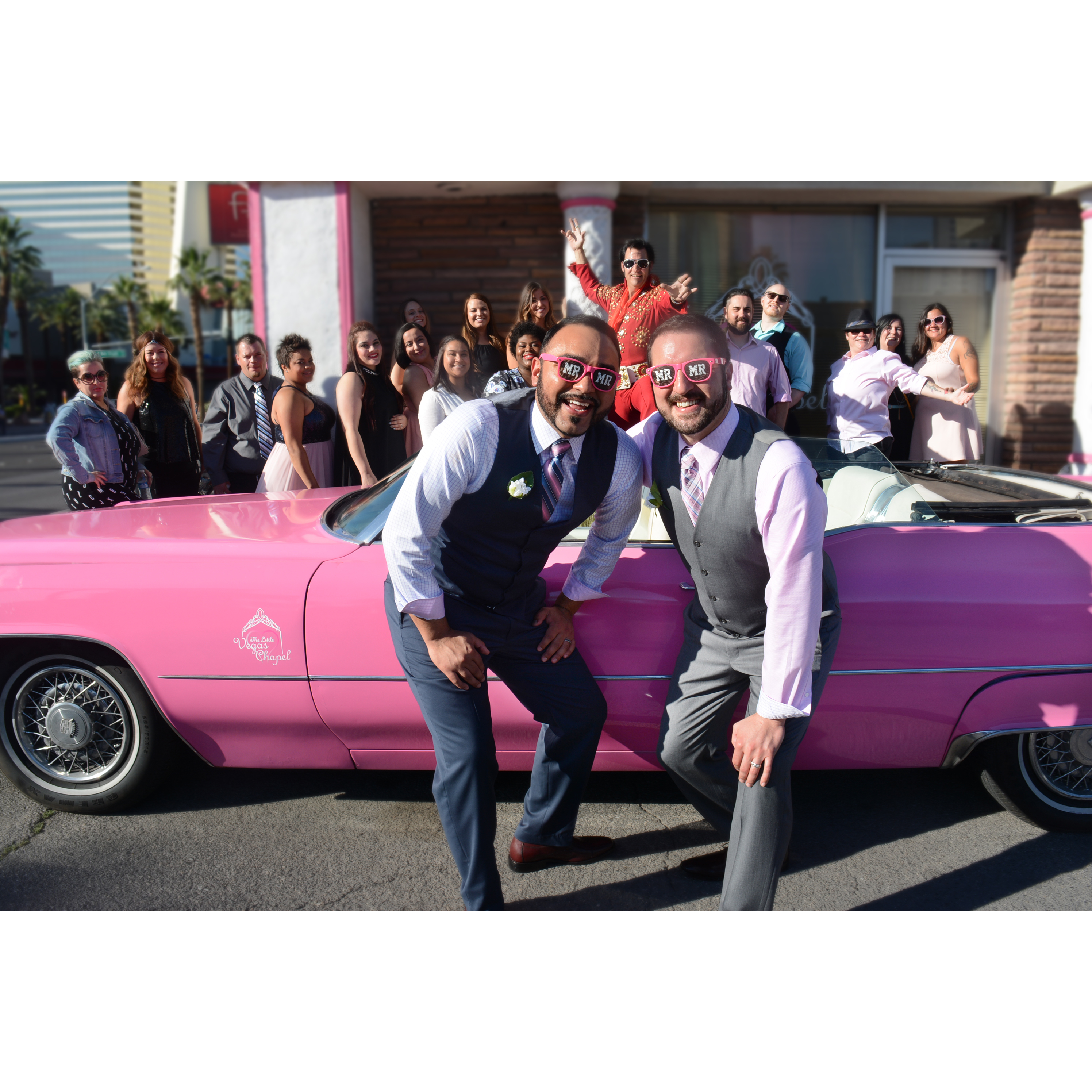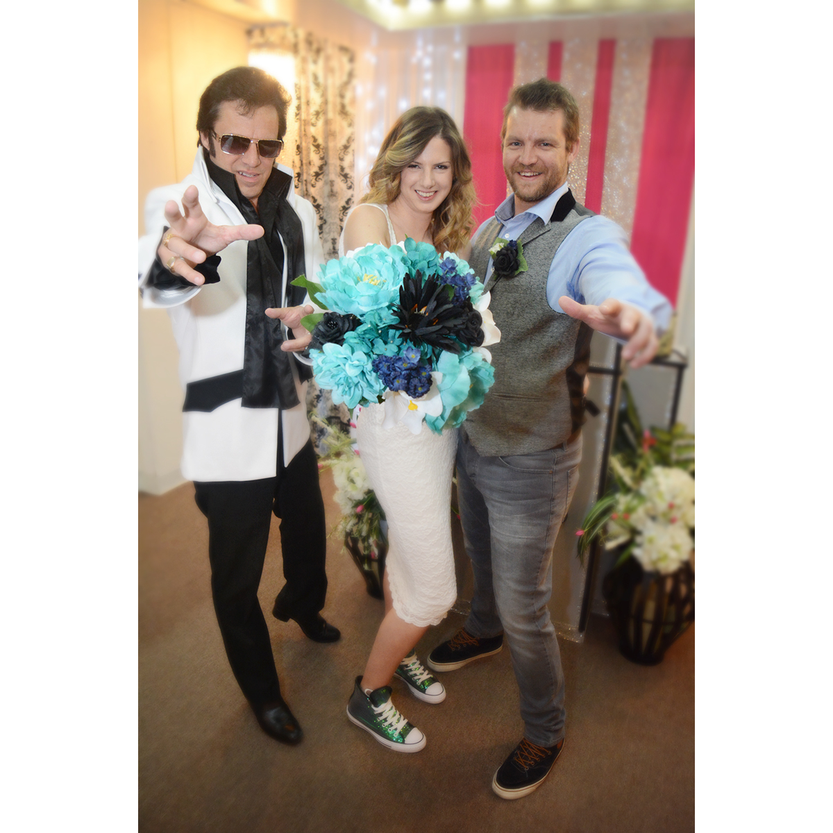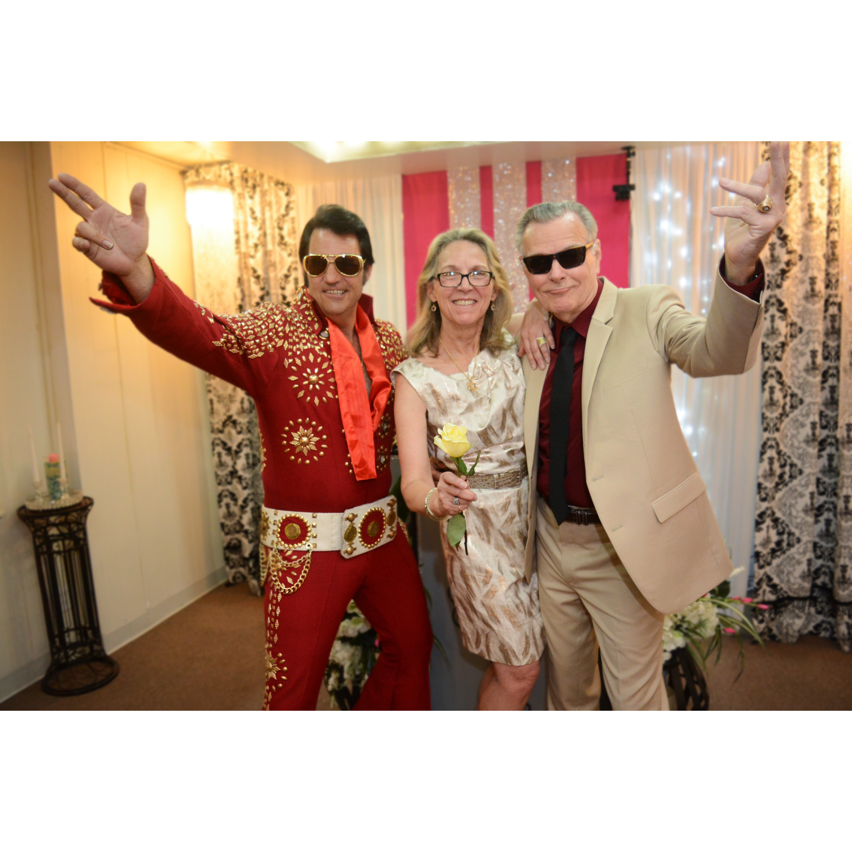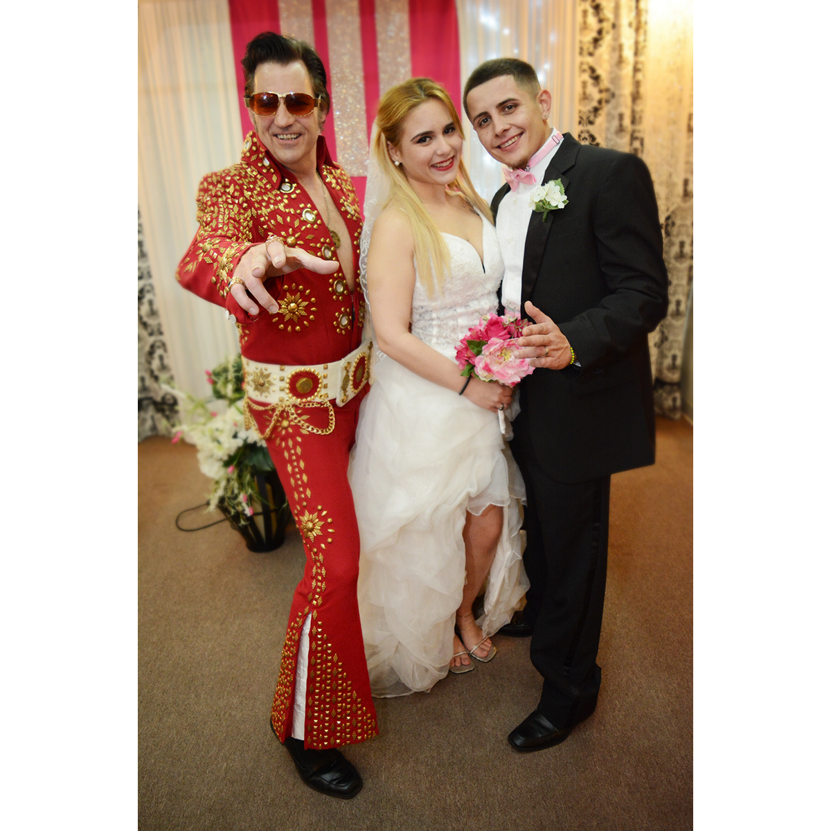 Courtesy ride from your hotel in our Pink Cadillac Enjoy the Las Vegas Strip with Elvis as your driver Chapel ceremony Elvis sings three of his greatest hits Unity candle ceremony Elegant silk bouquet Silk boutonnière Professional photography 30 Digital images Video recording of marriage ceremony Elvis glasses for the Bride and Groom Marriage license holder Las Vegas fuzzy dice Autographed photo of Elvis Witness provided if needed Completed marriage license or renewal of vows certificate Copy of Elvis and Priscilla’s marriage certificate Wedding coordinator Camera phones allowed