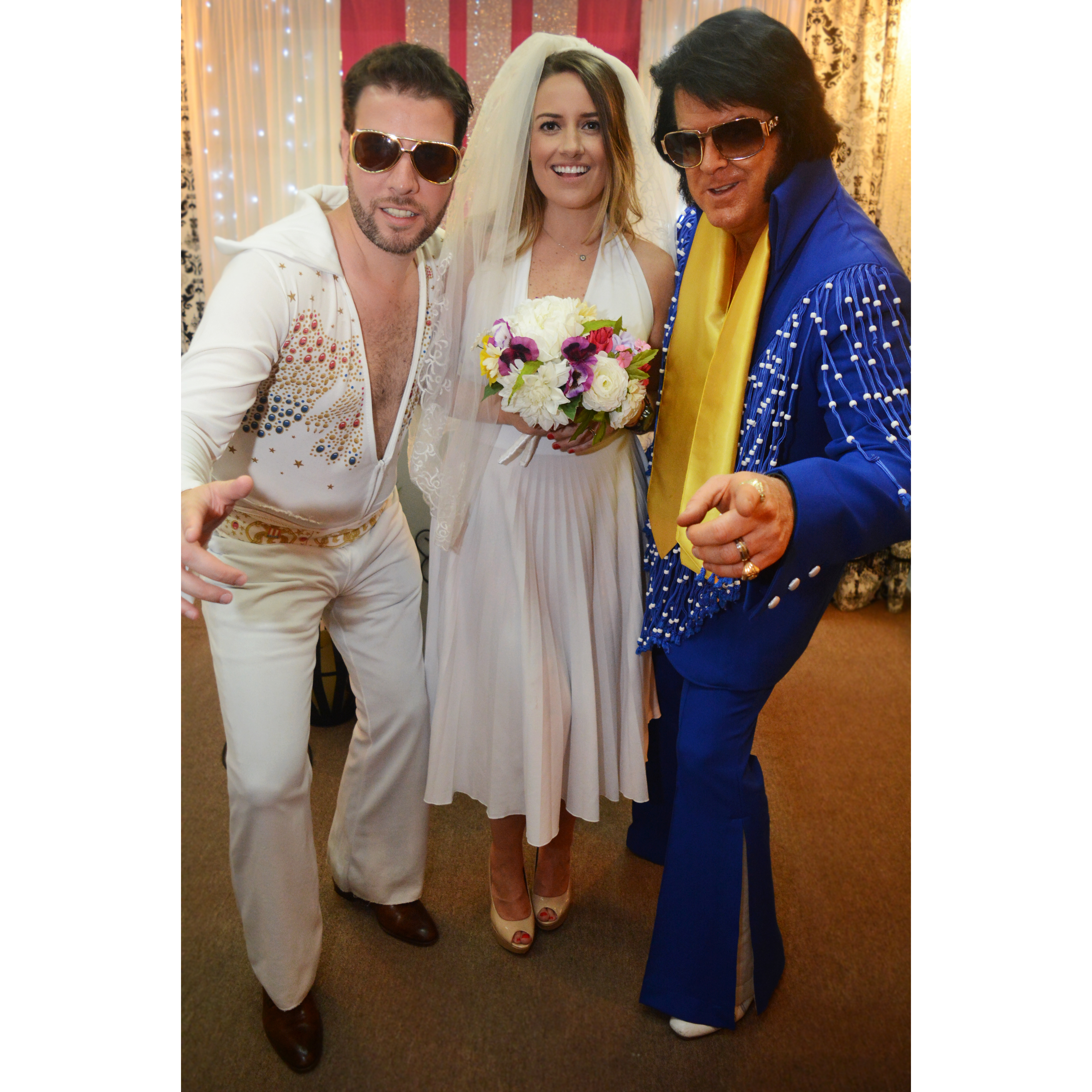 Chapel ceremony Elvis sings two of his greatest hits Special silk bouquet Silk boutonnière Professional photography 5 Digital images Witness provided if needed Completed marriage license or renewal of vows certificate Copy of Elvis and Priscilla’s marriage certificate Wedding coordinator Camera phones allowed