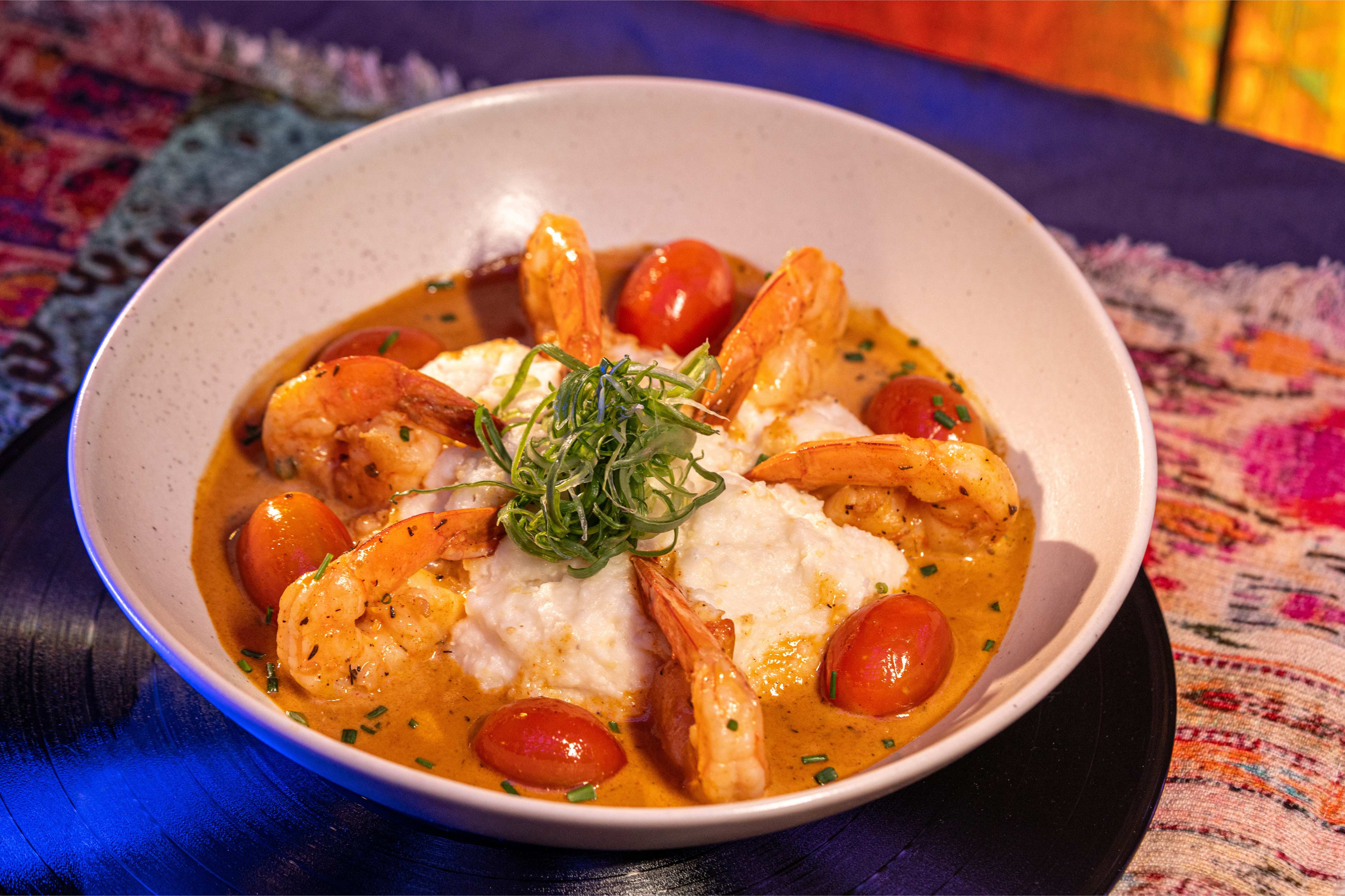 white cheddar grits, grape tomato, cajun cream option to add andouille sausage