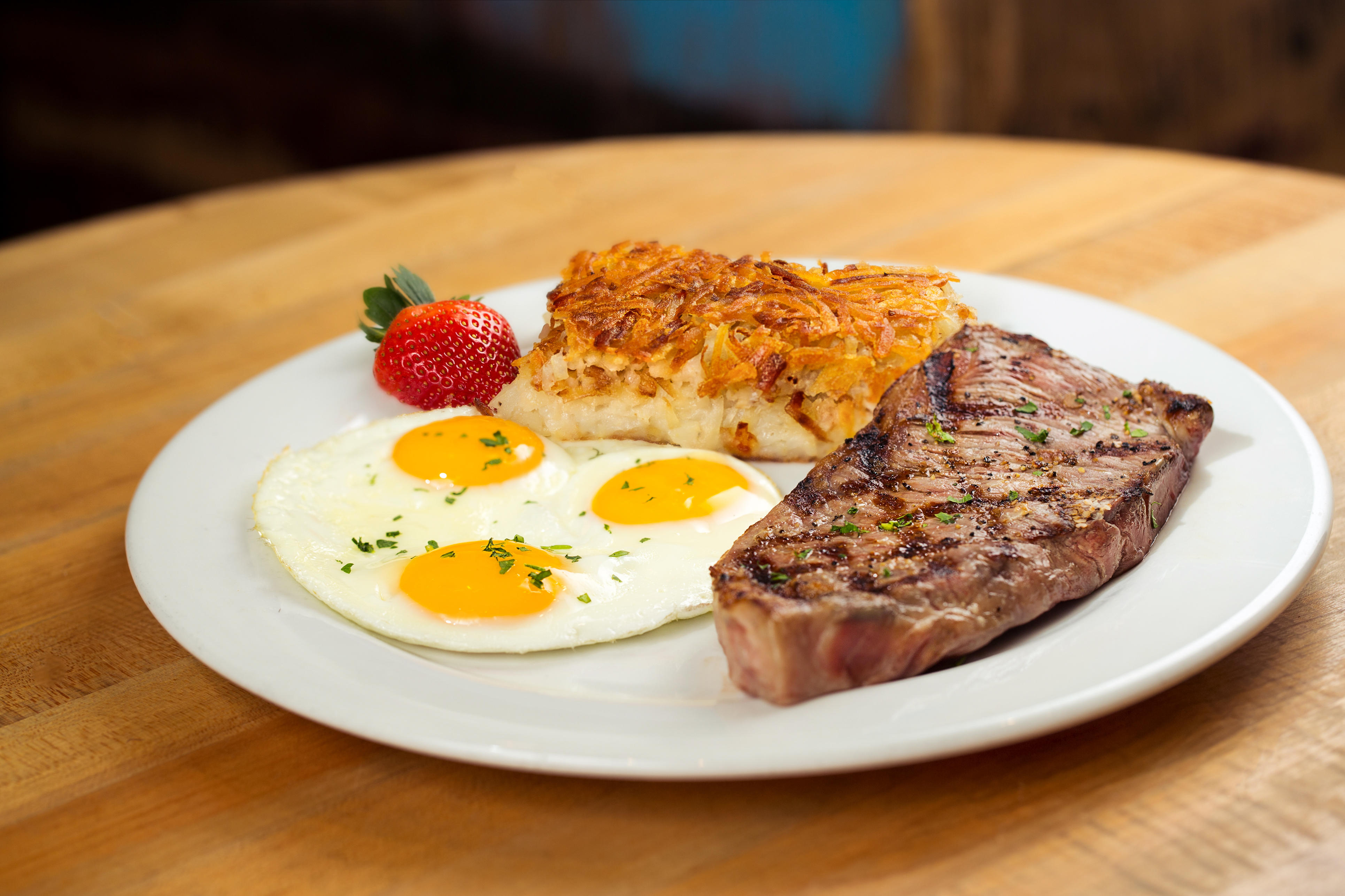 Three eggs any style, hash browns, choice of applewood bacon, breakfast sausage link, Canadian bacon, chicken apple sausage