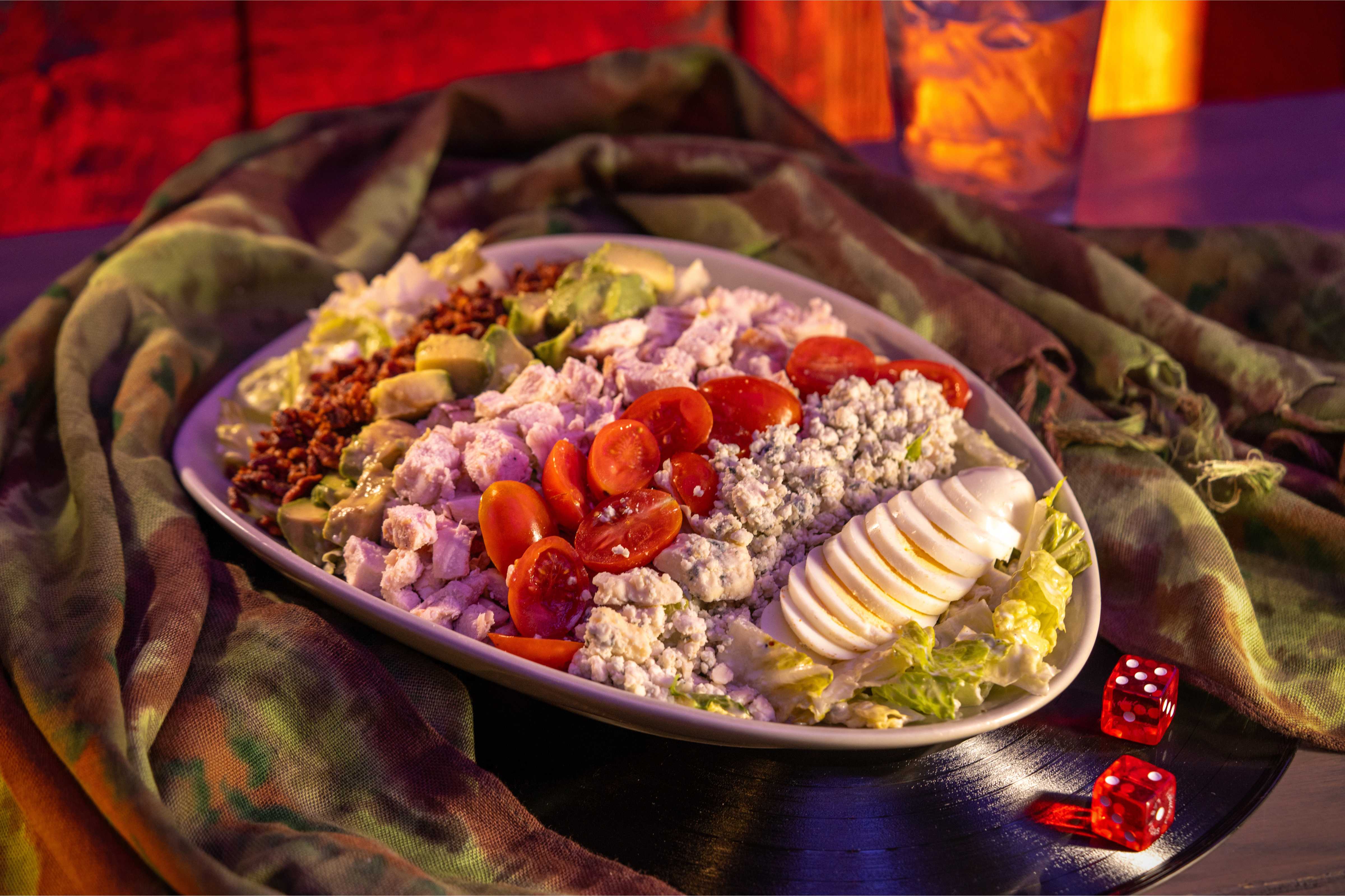 romaine, grilled chicken, avocado, tomato, blue cheese crumble, bacon, hard-boiled egg, blue cheese dressing