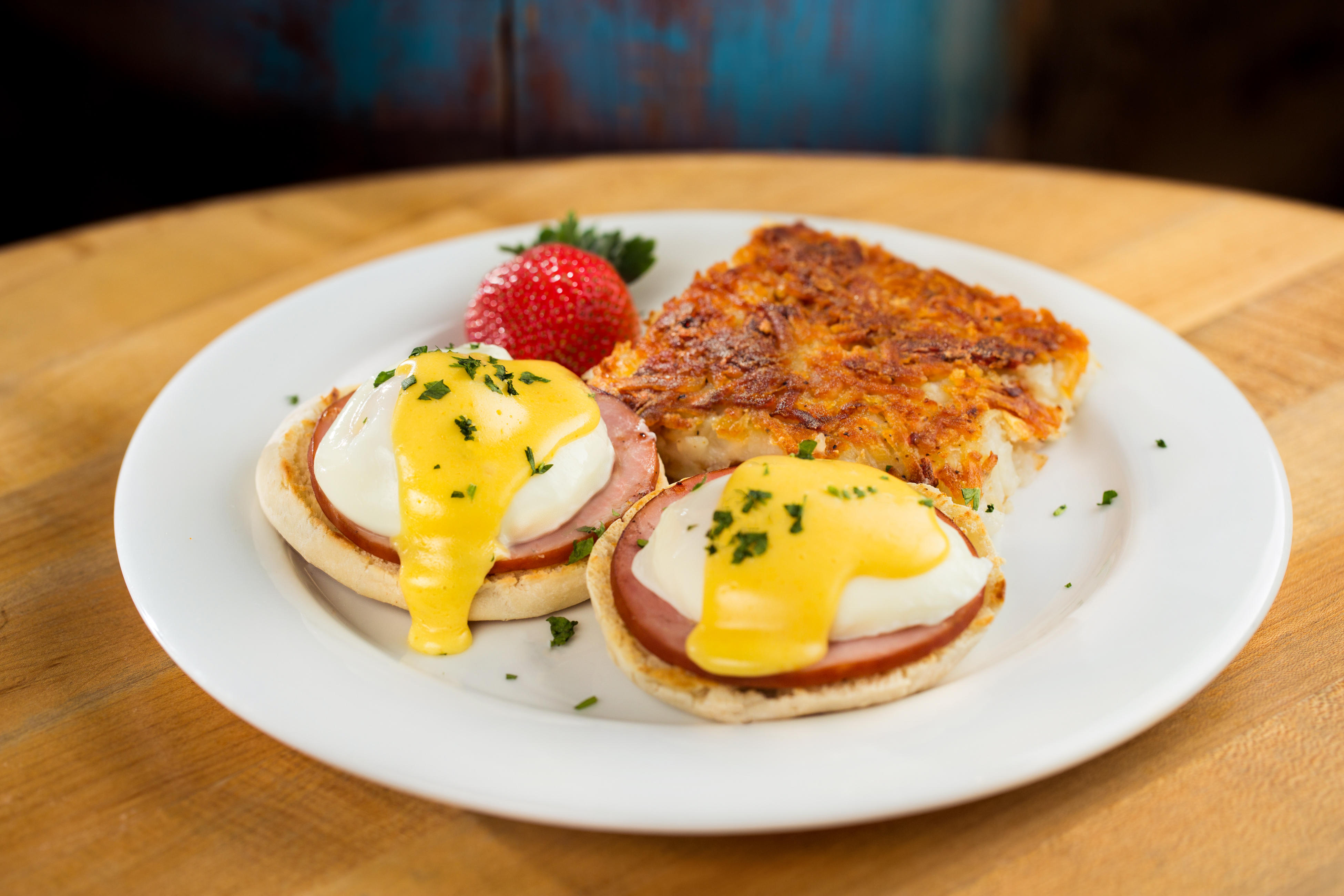 Two poached eggs, English muffin, Canadian bacon, Hollandaise sauce, hash browns