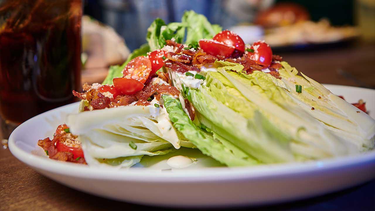 romaine lettuce wedge, crumbled bacon, chives, cherry tomatoes and toasted breadcrumbs, with blue cheese dressing