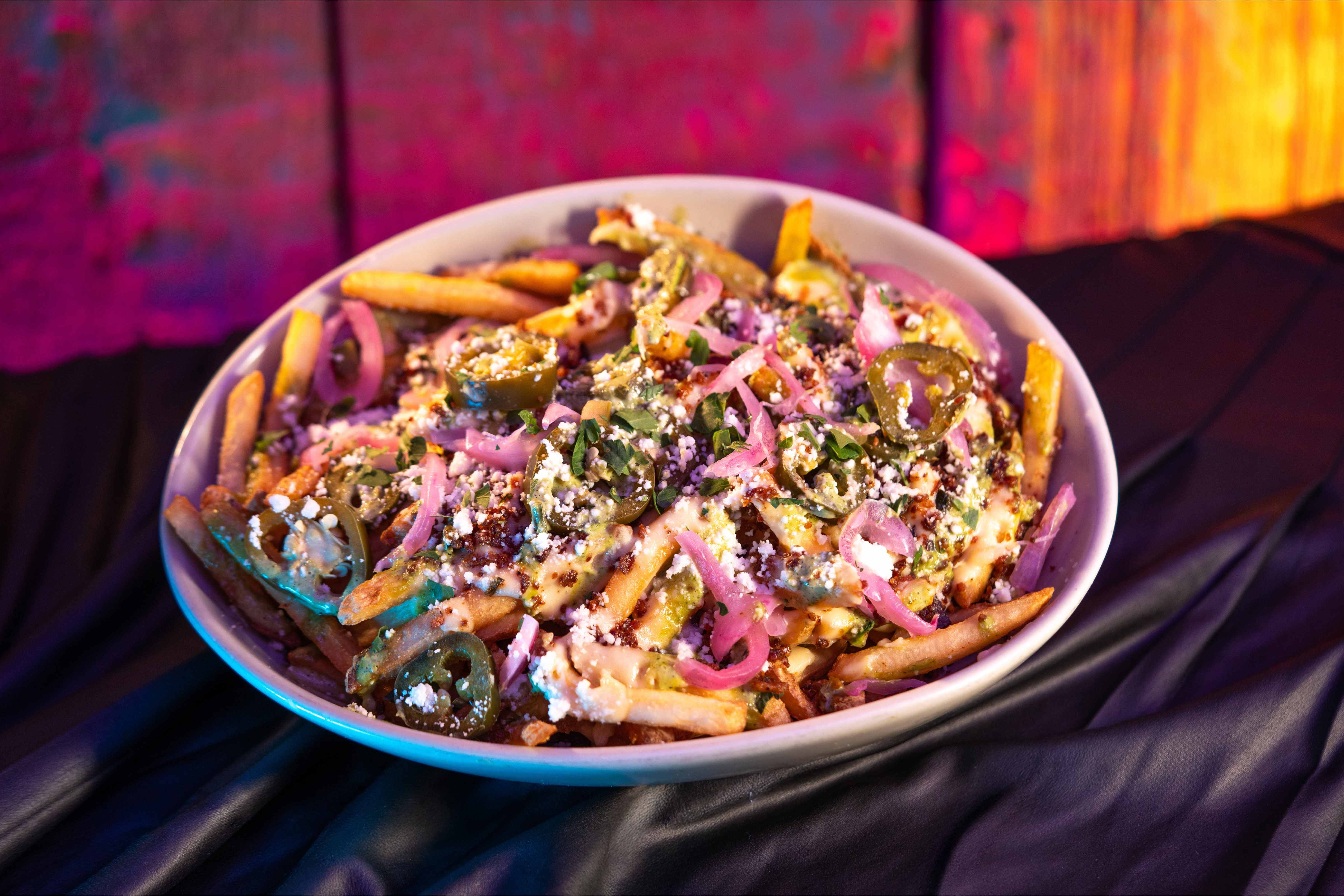jalapeño-bacon, pickled red onion, four cheese sauce, cilantro crema, cotija cheese Option to add chicken, pork, steak or brisket
