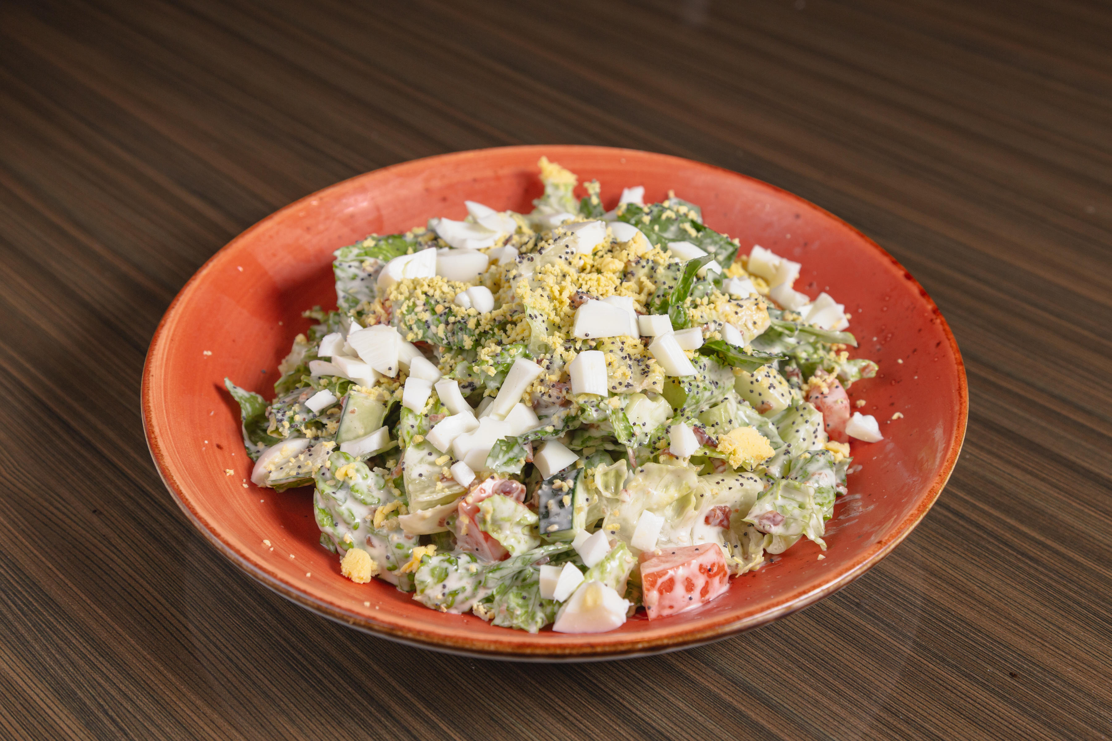 Romaine lettuce, smoked bacon, avocado, cucumber, tomato, hardboiled egg, everything ranch dressing