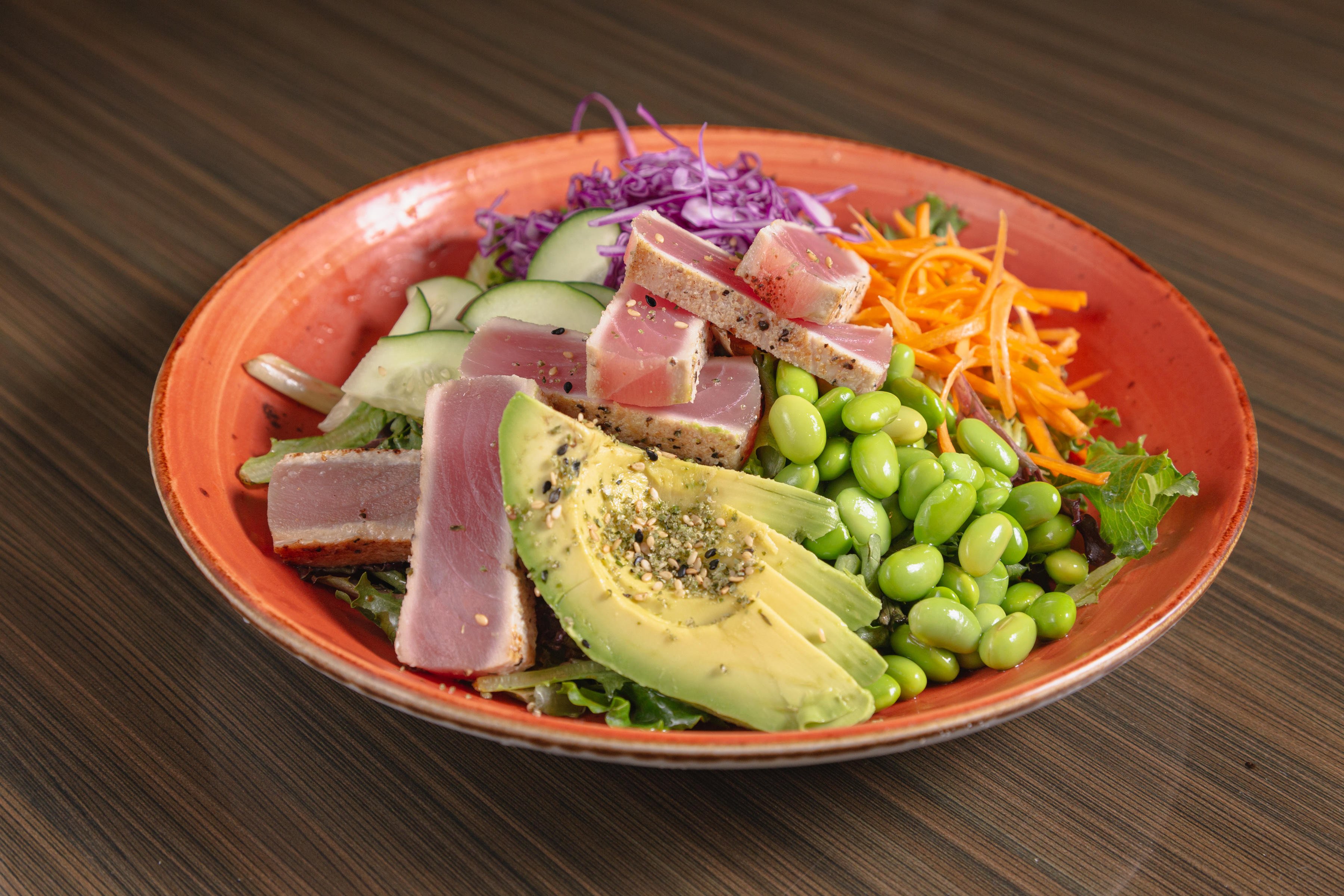 Greens, red cabbage, ahi, avocado, carrots, cucumber, edamame, soy ginger dressing