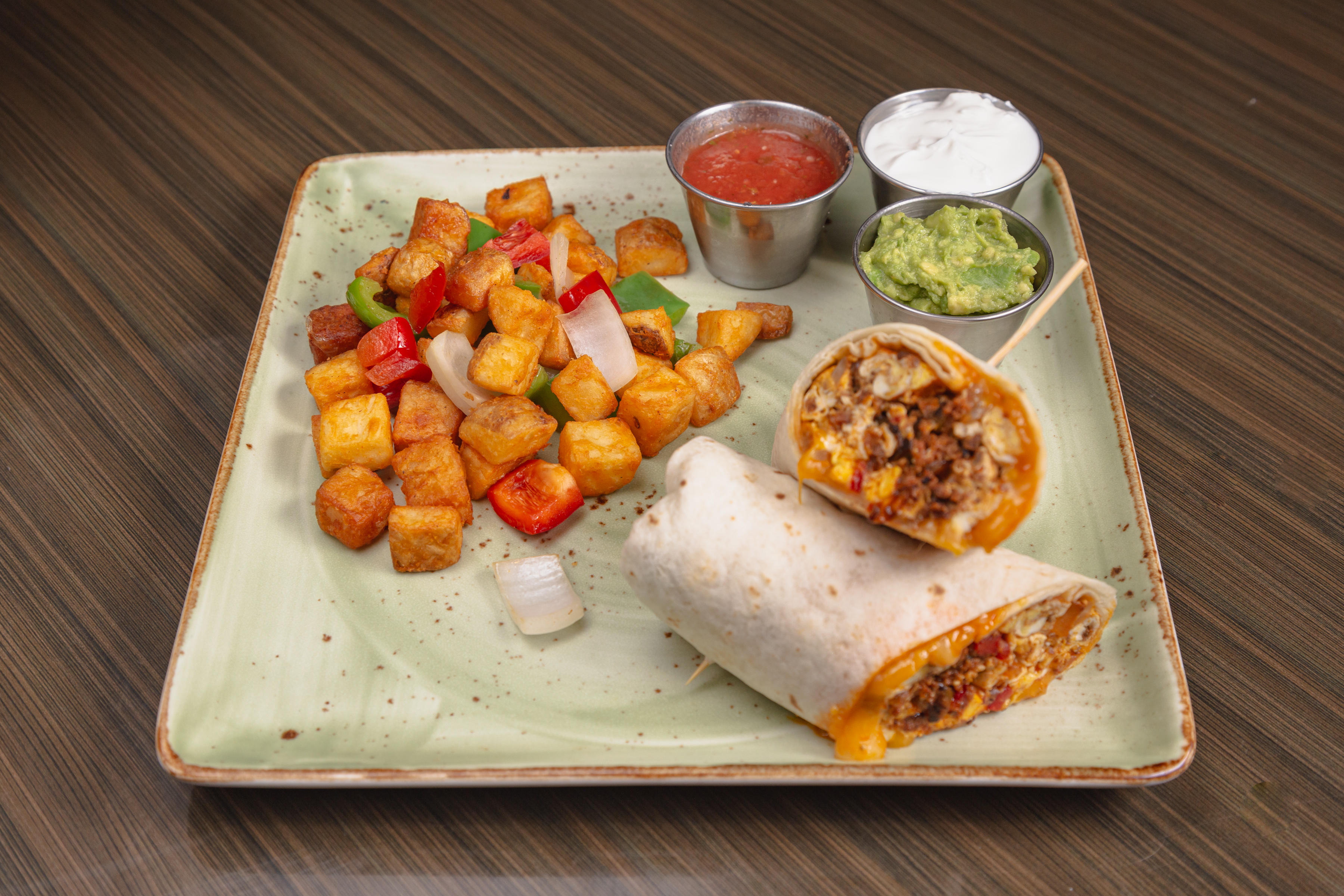 Scrambled eggs, chorizo, onion, bell pepper, pepper jack and cheddar cheeses, breakfast potatoes, sour cream, guacamole, salsa, flour tortilla