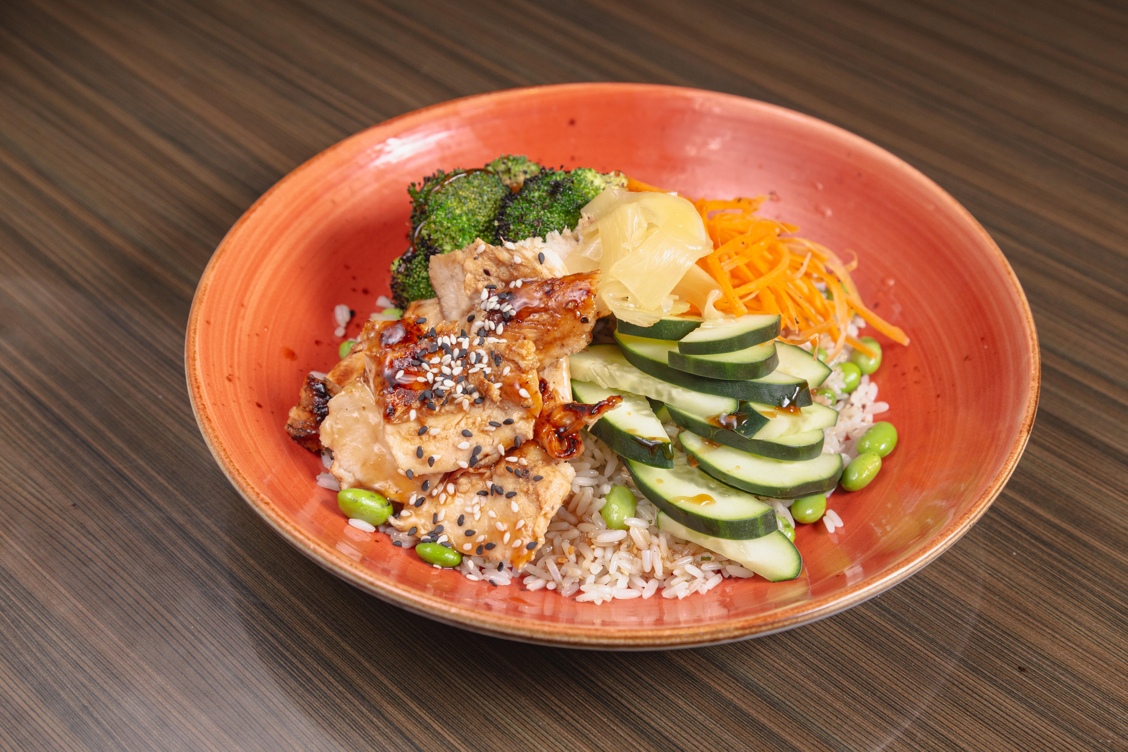 Steamed rice, grilled chicken, broccoli, edamame, cucumber, carrots, pickled ginger, toasted peanuts, sesame seeds