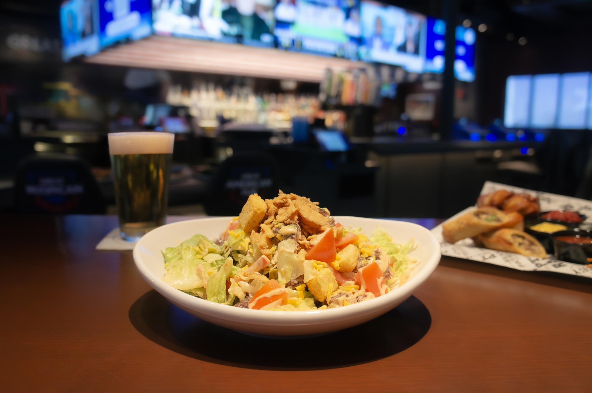 Grilled beef patty, cheddar cheese, chopped lettuces, diced pickles, diced tomatoes, crispy onions, croutons, burger sauce dressing